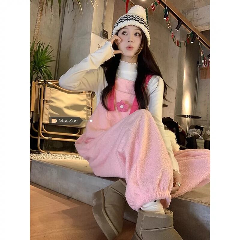 ピンクのラムズウールオーバーオール女性の冬スタイルルーズ 2023 新しい甘い年齢を減らすピンク脚ジャンプスーツ 大人ガーリー スウィート キュート カジュアル ウィンター 冬物 857163672859209