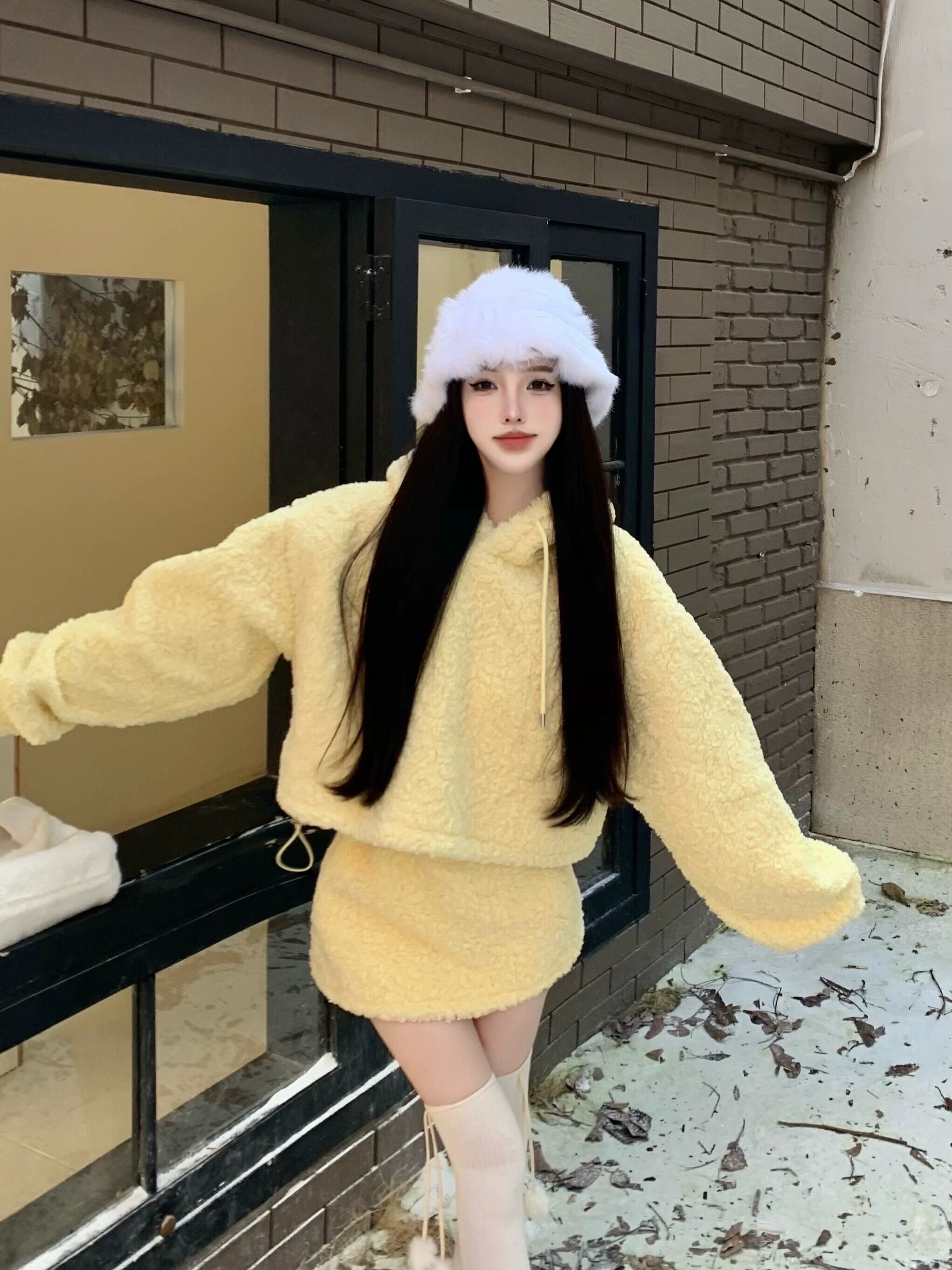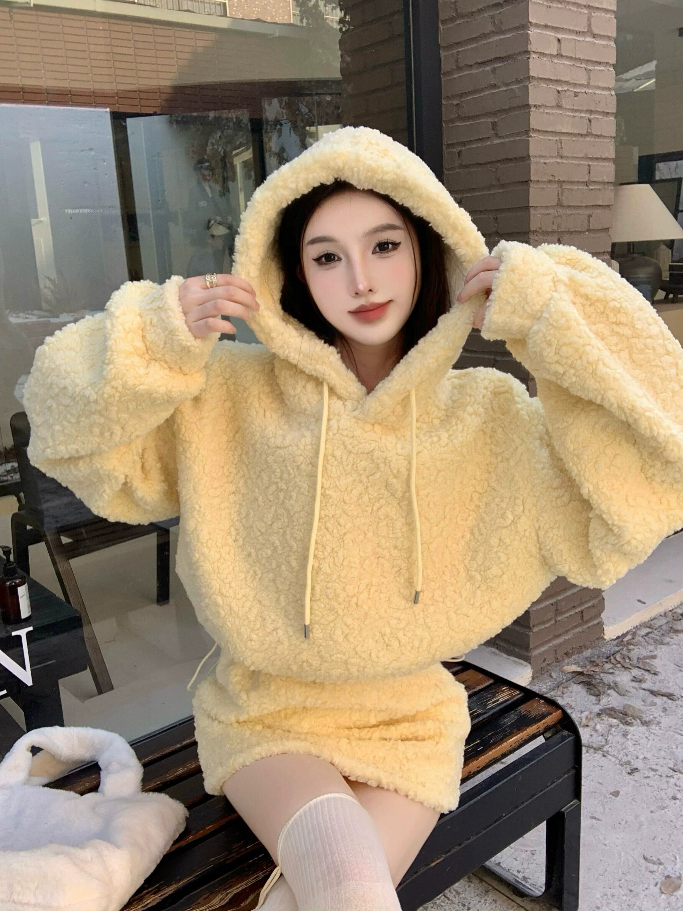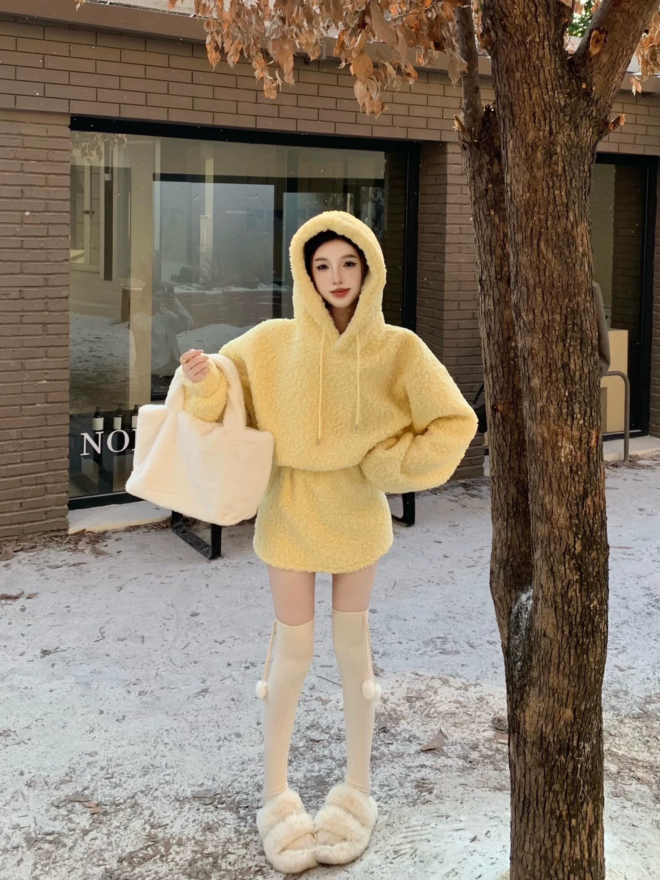 黄色のラムウールのフード付きスウェットシャツの女性の秋冬 2023 新しいスタイルの小さな超素敵な長袖ショートトップ ロング オータム 秋物 ウィンター 冬物 8571652498400126