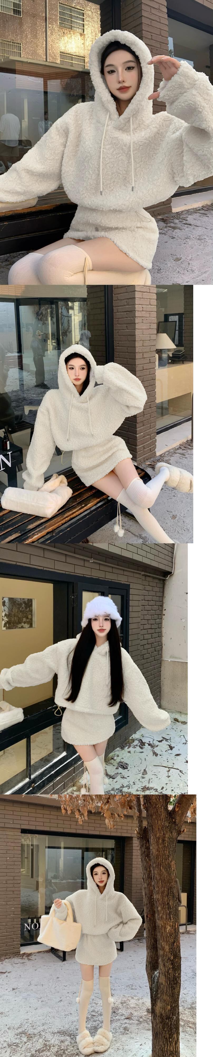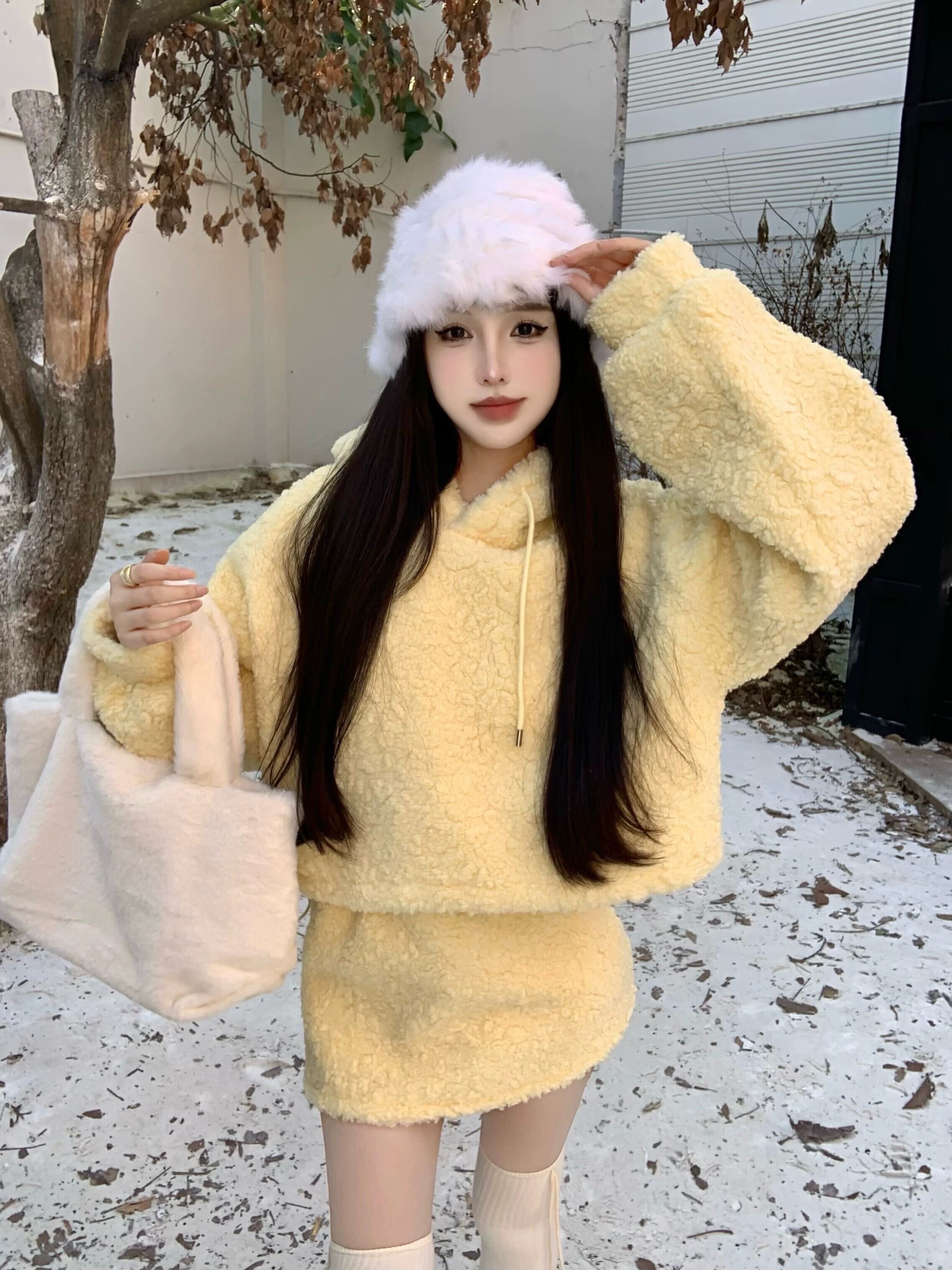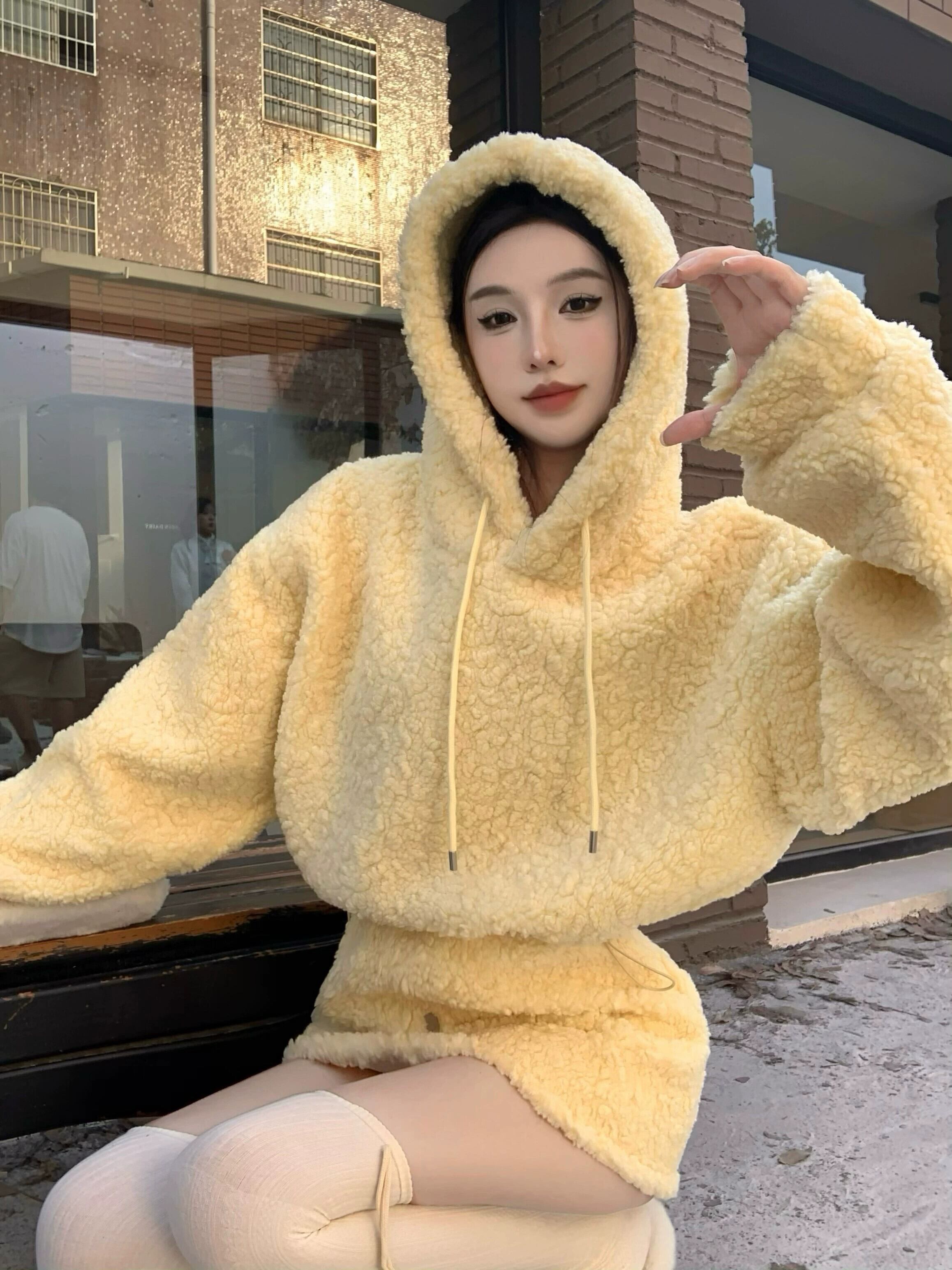 黄色のラムウールのフード付きスウェットシャツの女性の秋冬 2023 新しいスタイルの小さな超素敵な長袖ショートトップ ロング オータム 秋物 ウィンター 冬物 8571652498400126