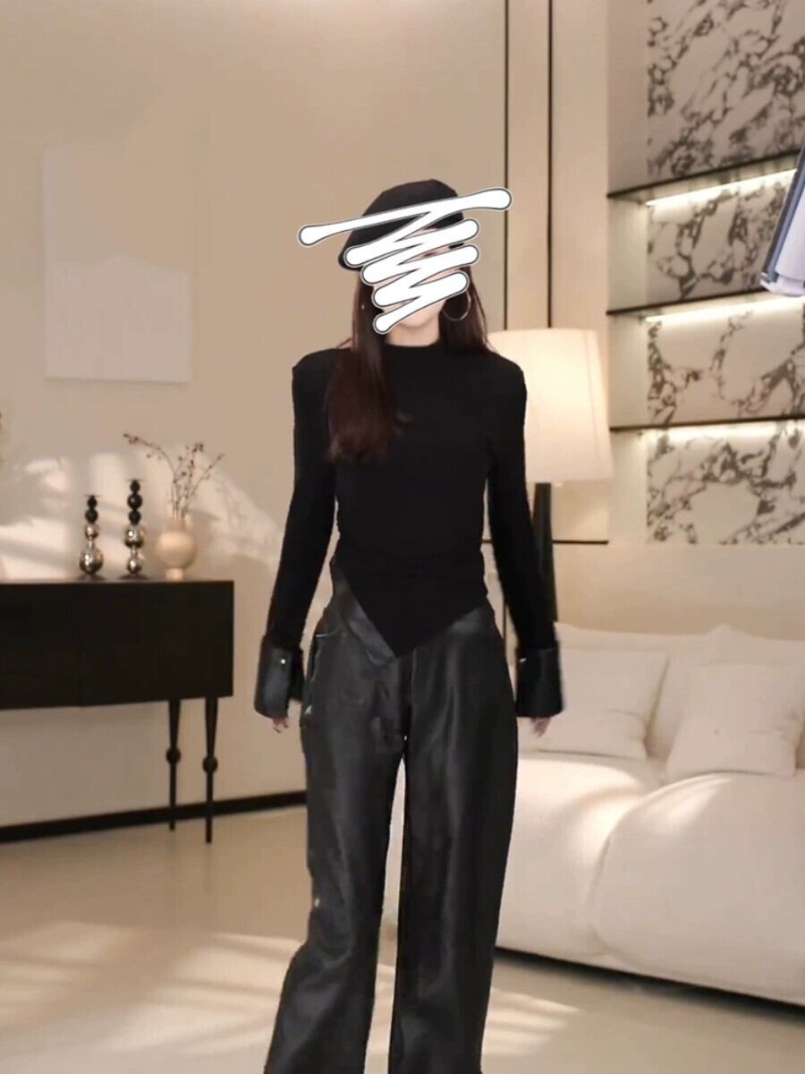 不規則なパッチワークレザートップ女性の秋と冬のプラスベルベットハーフタートルネックインナーレイヤリングシャツ、ファッショナブルで美しい茶色の長袖Tシャツ ロング オータム 秋物 ウィンター 冬物 8571695490845244