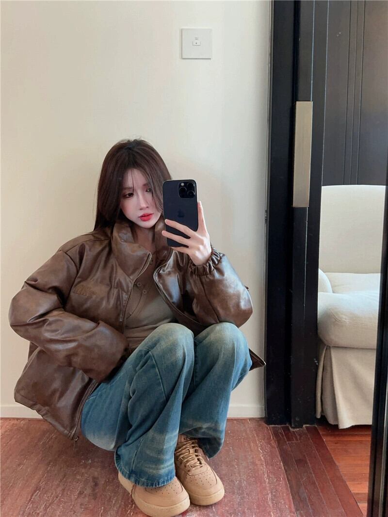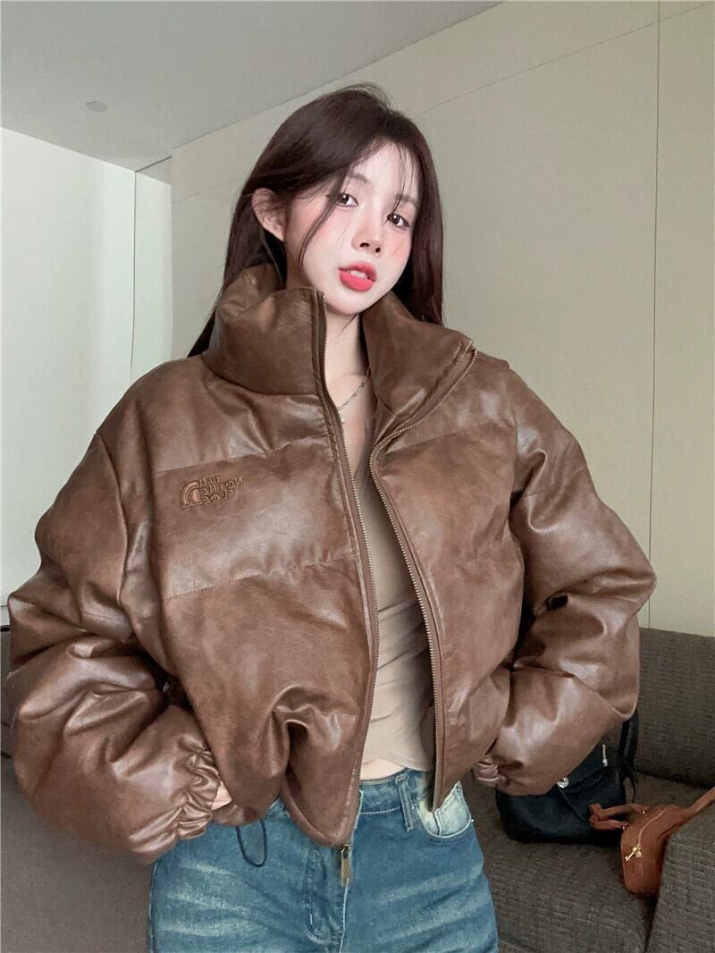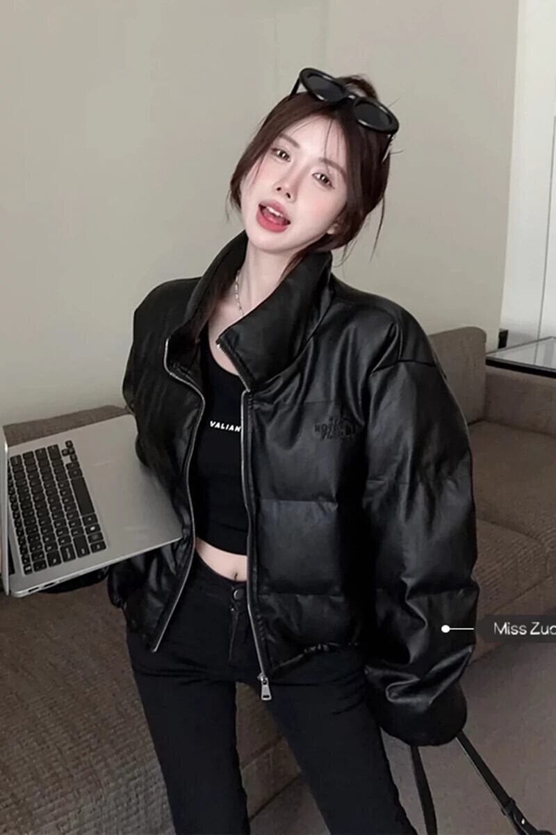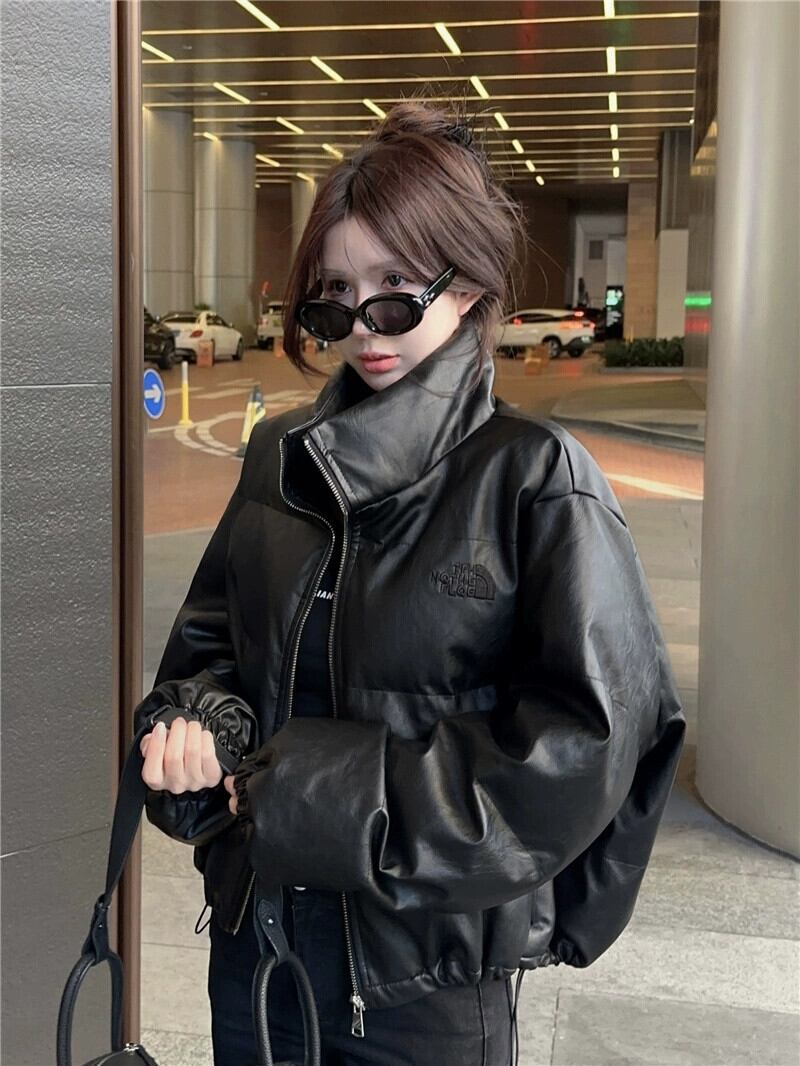 黒 PU レザーコットンジャケット女性の冬肥厚コットンジャケットアメリカンレトロハイエンドショートパンコートコットンコート ブラック ウィンター 冬物 8571688977728412