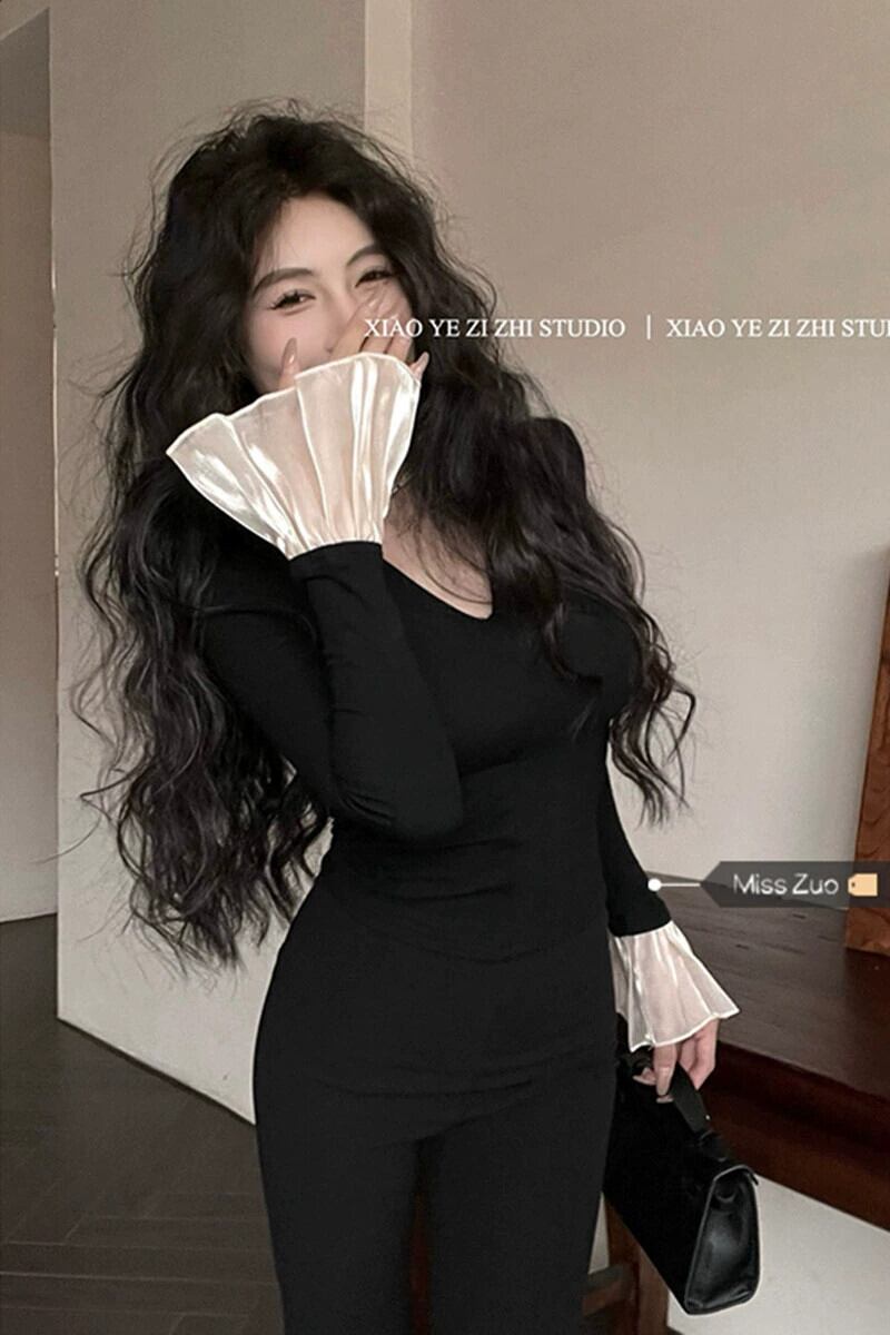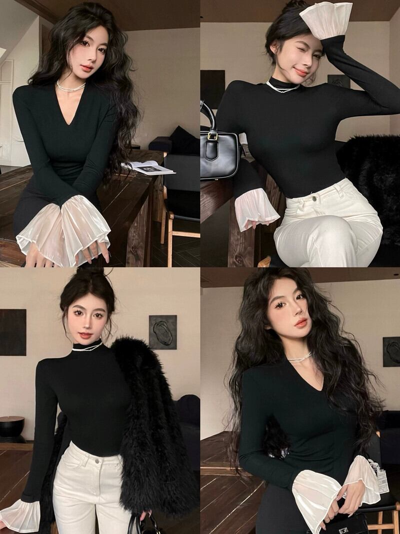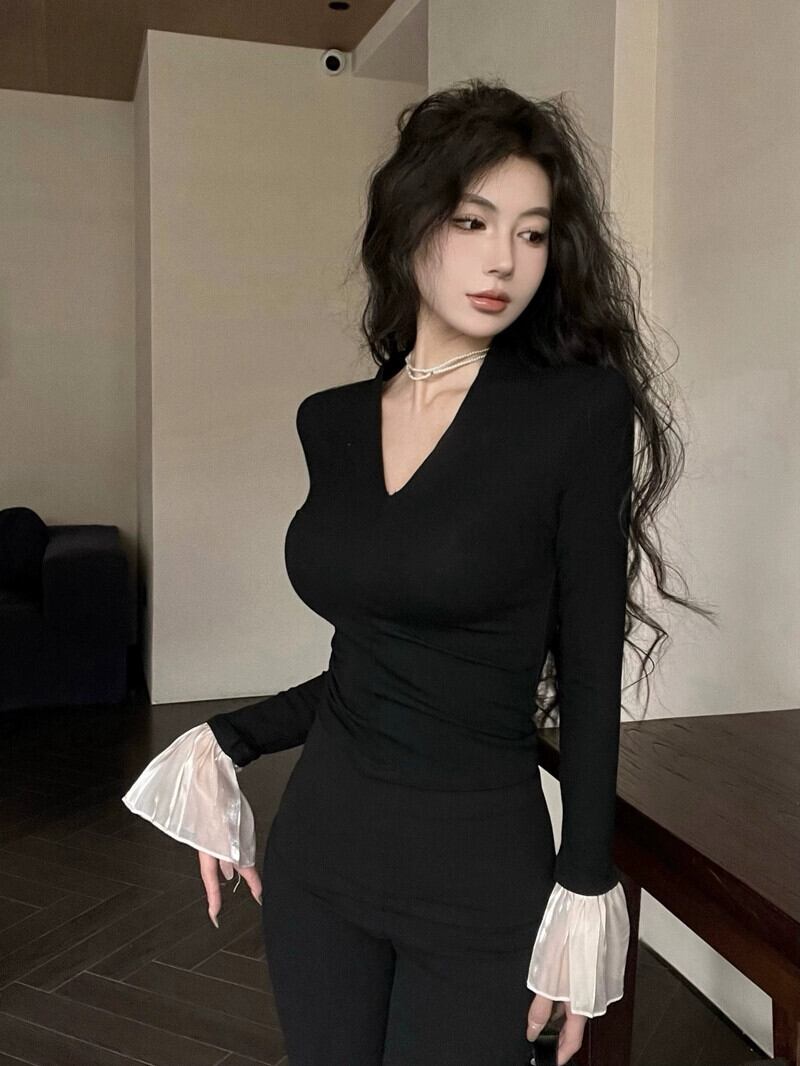 秋冬の起毛とベルベットのインナーボトリングシャツレディース。黒のベルスリーブ T シャツ。とても素敵なVネックのショートトップス。 ブラック オータム 秋物 ウィンター 冬物 Tシャツ 8571668932489773