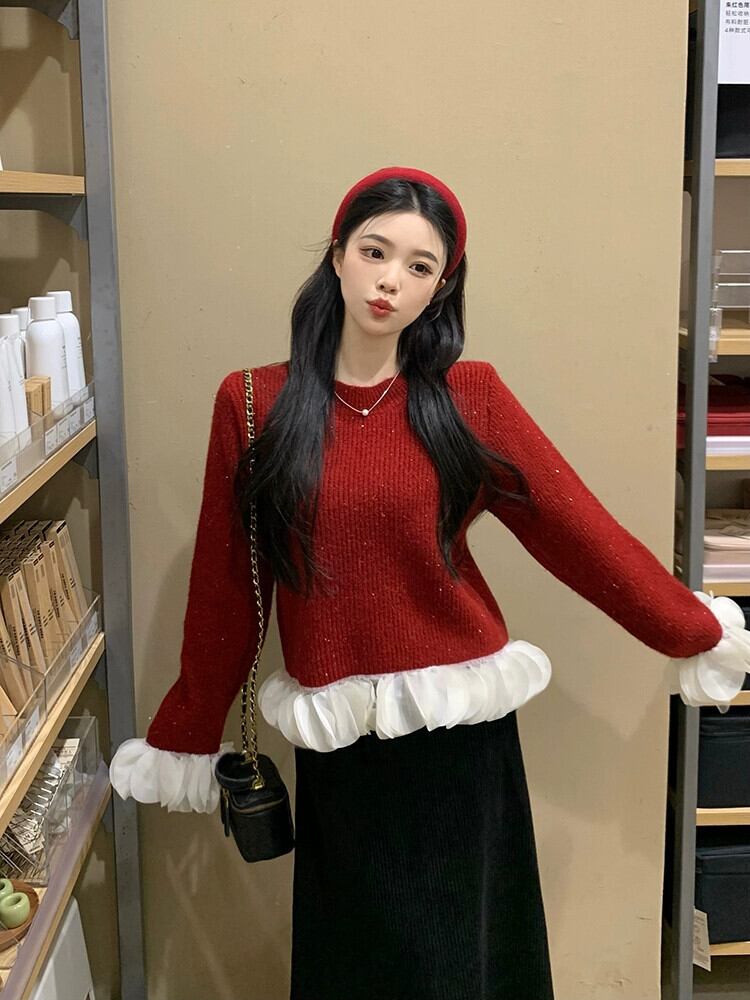 フランスのレトロなハイエンドの花びらカシミアセーター女性の秋と冬のボトリングシャツと年の赤いセータートップ レッド オータム 秋物 ウィンター 冬物 8571665340425537