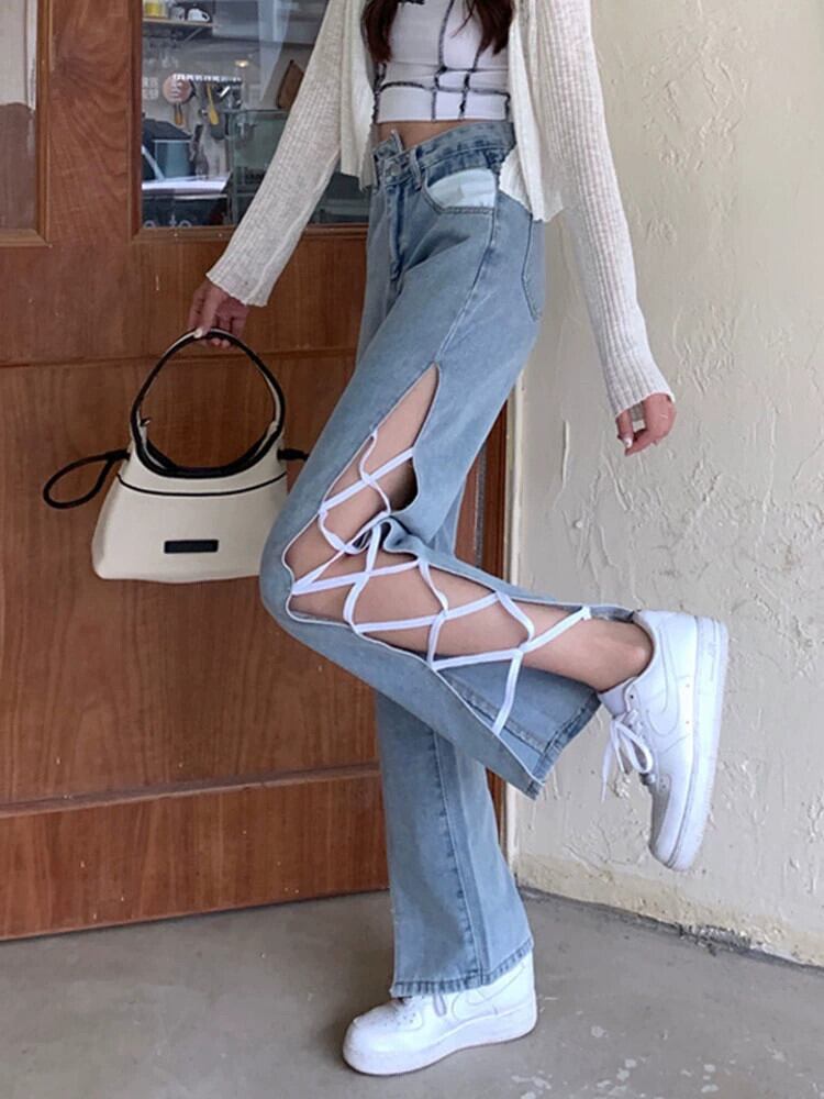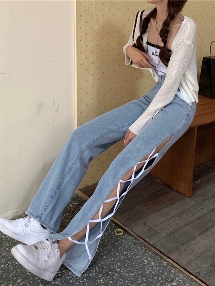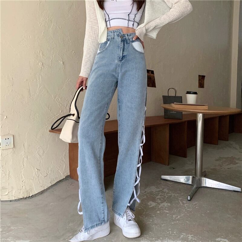 レースアップジーンズレディース春秋薄手スリットパンツ変則ハイウエストデザイン甘辛ワイドレッグパンツ ハイウェスト 大人ガーリー スウィート キュート カジュアル スプリング 春物 オータム 秋物 ワイドパンツ 8571695337809075