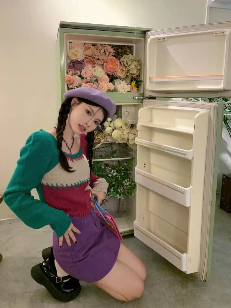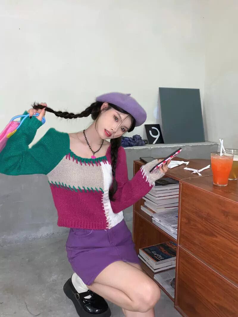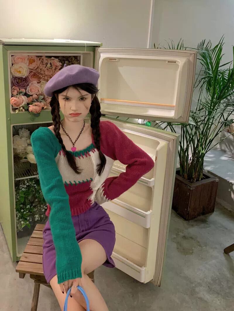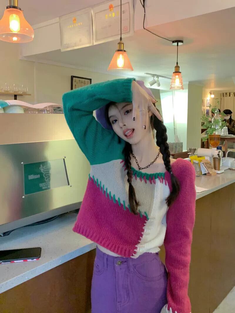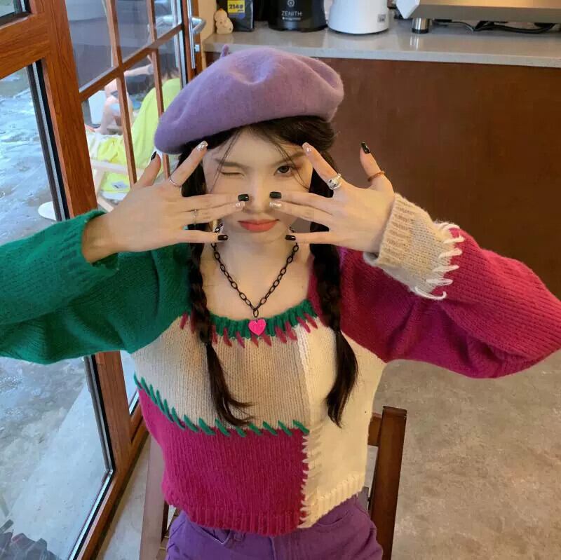 カラーブロックプルオーバーレディース2023秋新デザインニッチシックショートセータースクエアネックトップ オータム 秋物 スクウェア 8571634078676592