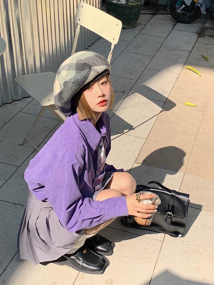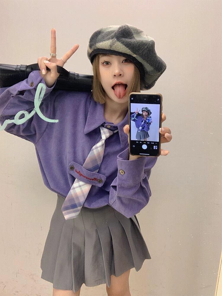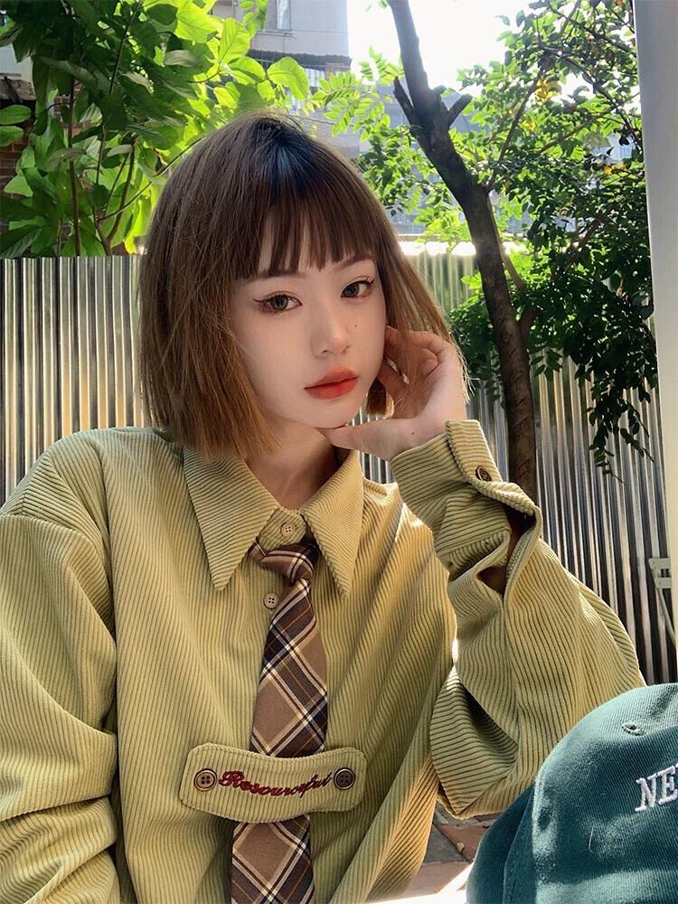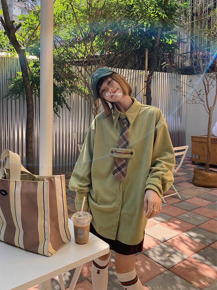 グリーンコーデュロイシャツ女性秋 2023 新しいカレッジスタイル甘い年齢軽減シャツ小さな長袖トップ ロング 大人ガーリー スウィート キュート カジュアル オータム 秋物 8571653412065474