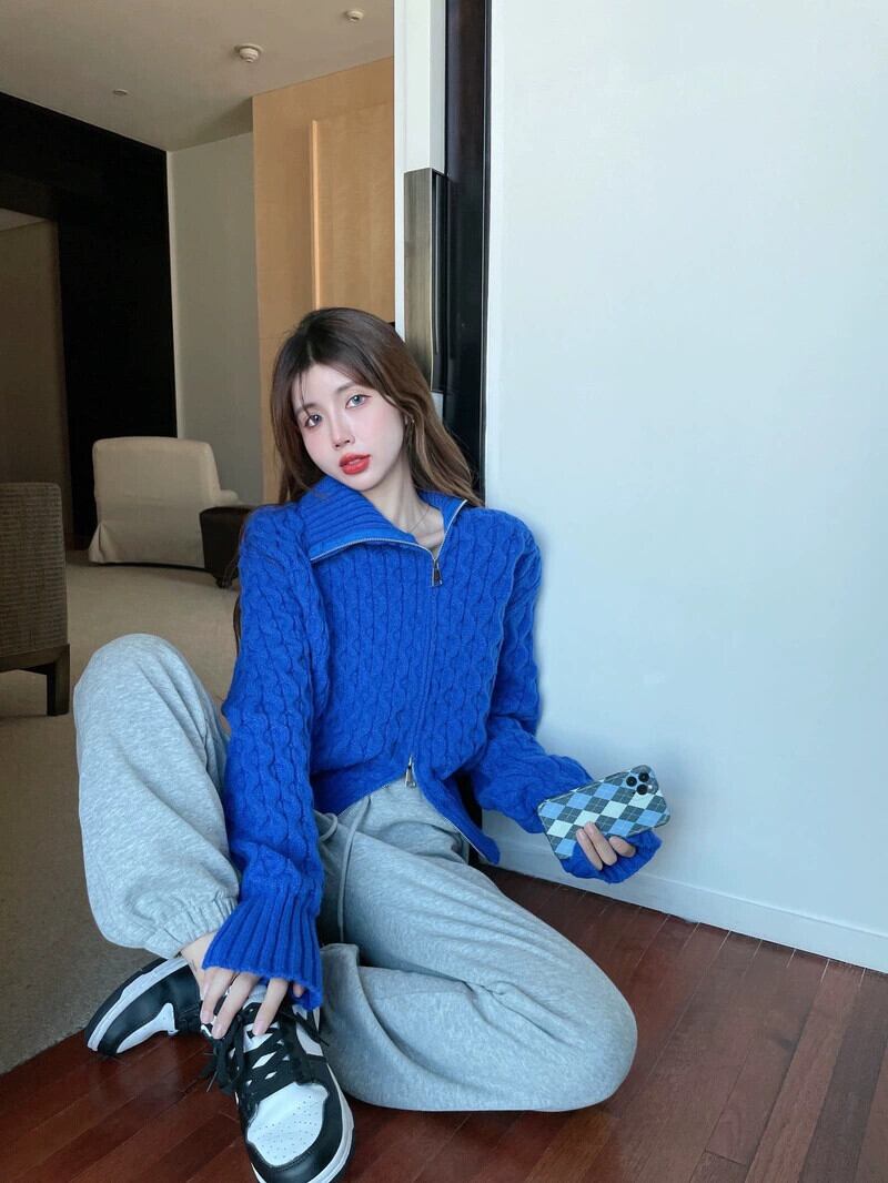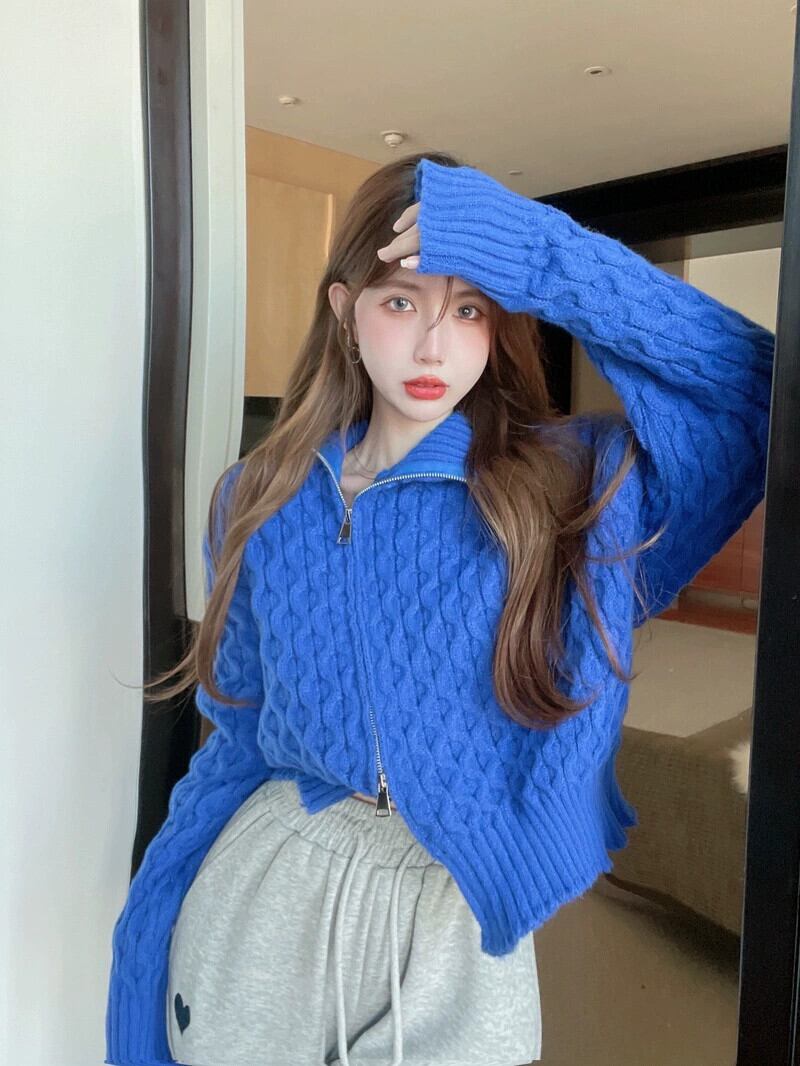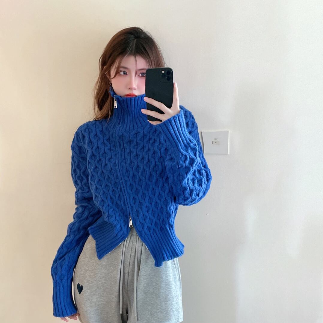 クラインブルーダブルジッパーセータージャケット女性の秋の2023新しい緩いレトロデザインニットカーディガン オータム 秋物 8571624294292698