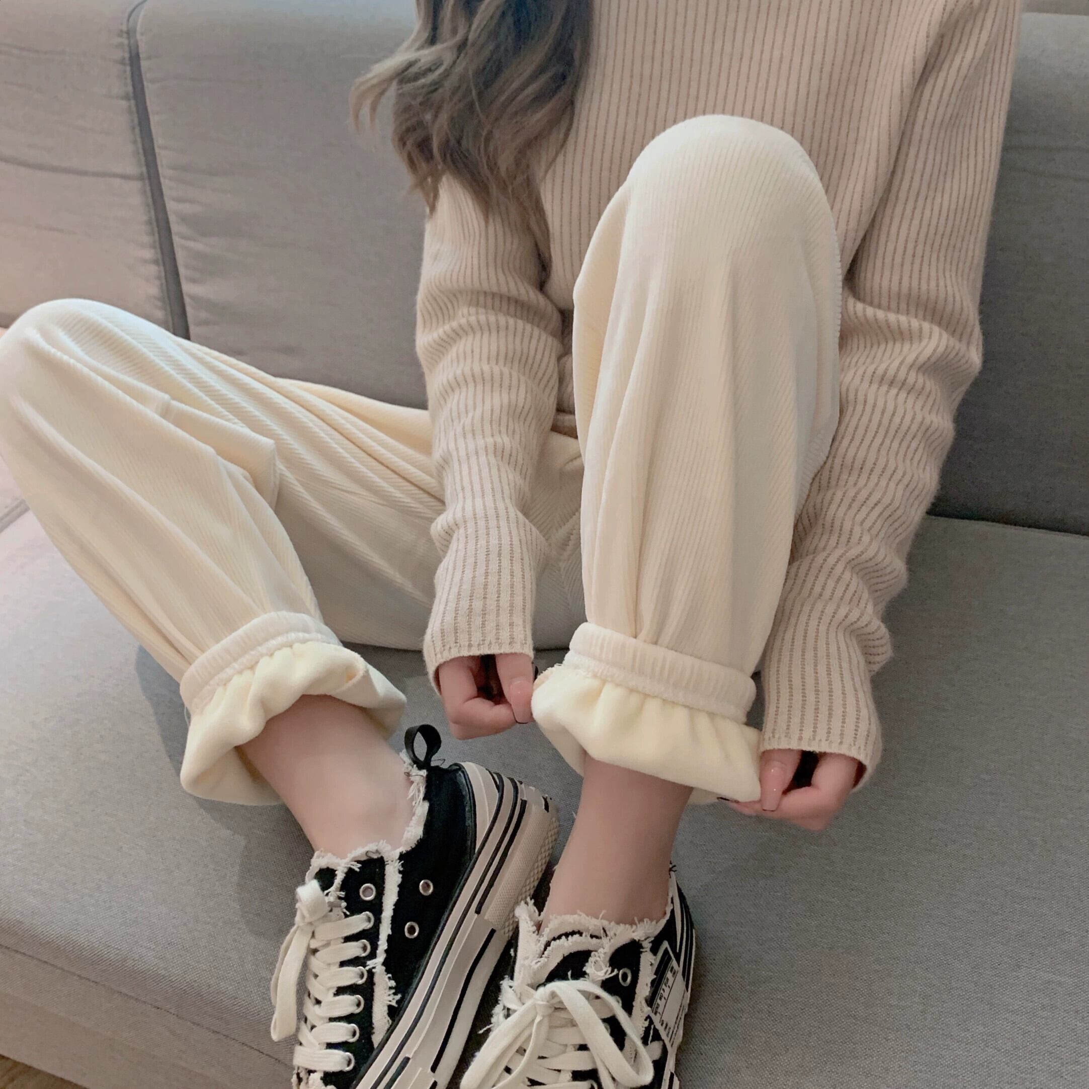 シェニールワイドレッグパンツの女性の秋プラスベルベットと肥厚2023新しいルーズストレートハイウエストフロアレングスカジュアルロングパンツ オータム 秋物 8571633773927699