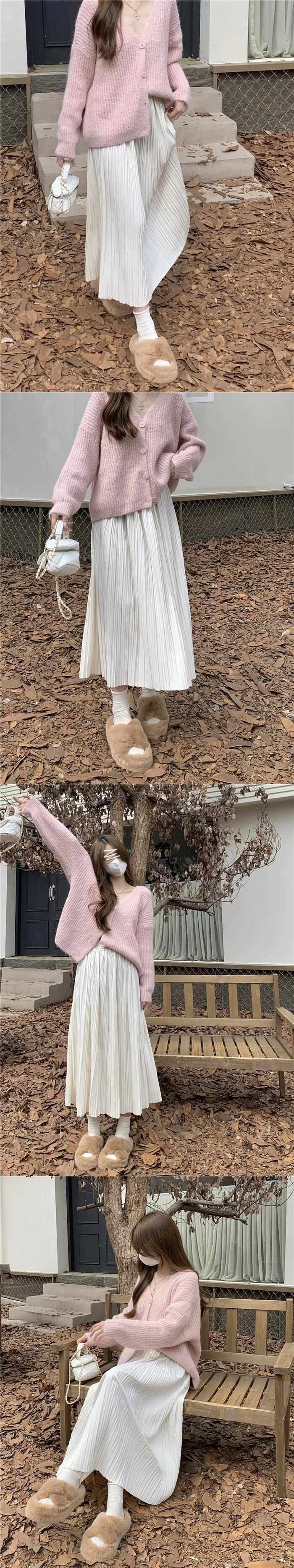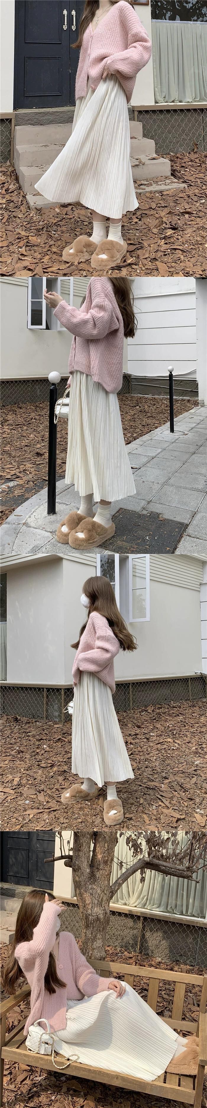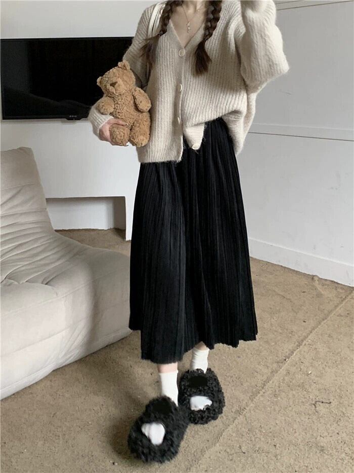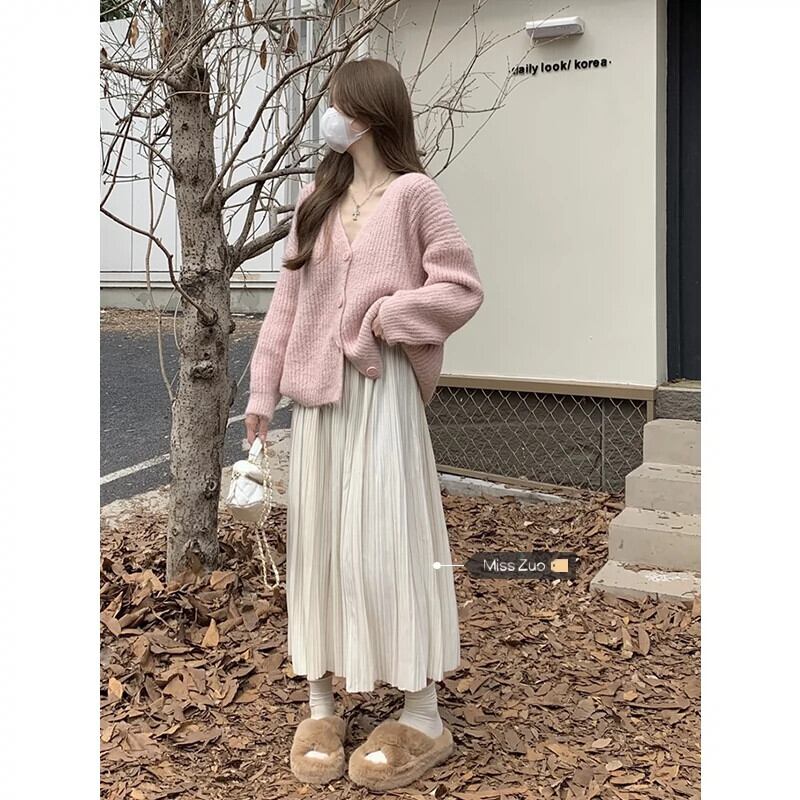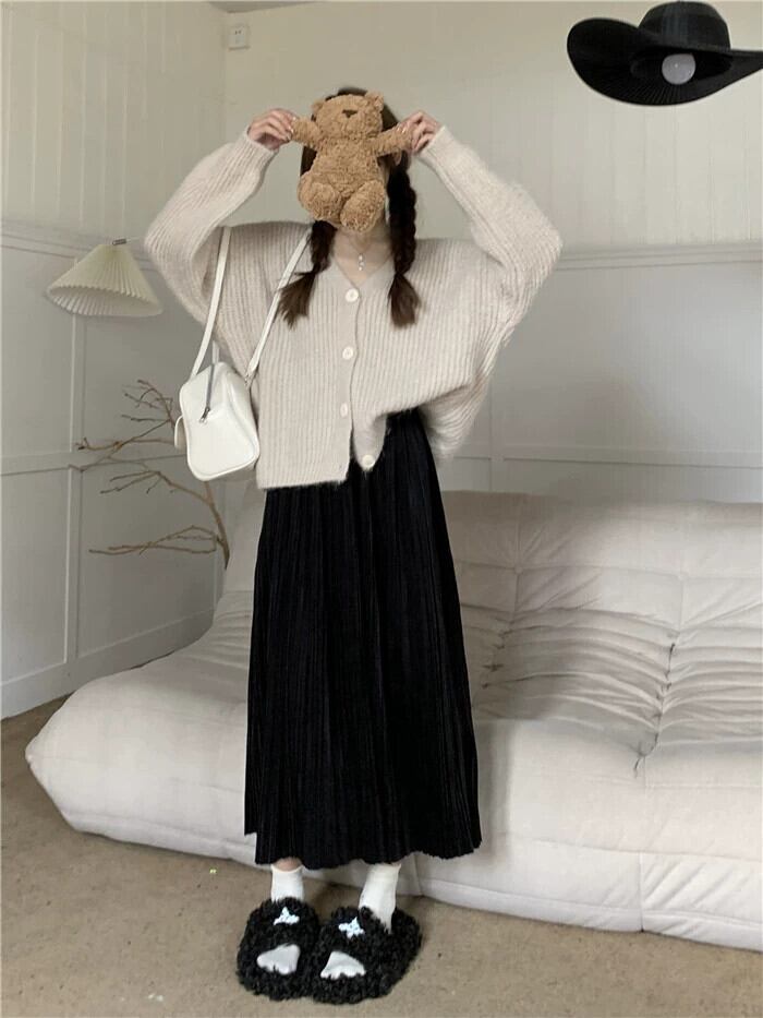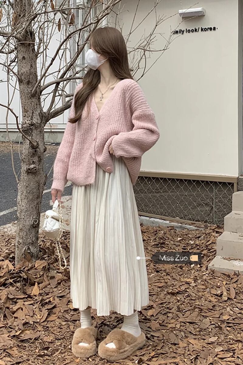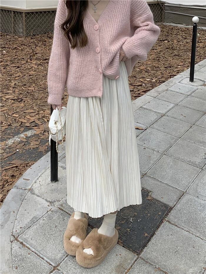 色:アプリコットスカート,黒スカート,ピンクのセーター,ミルクティーセーター