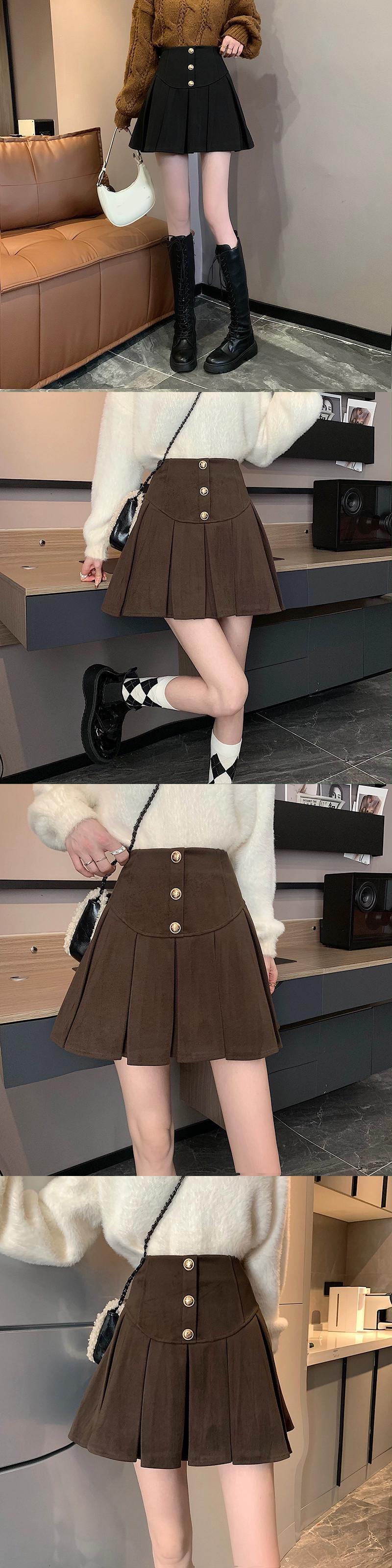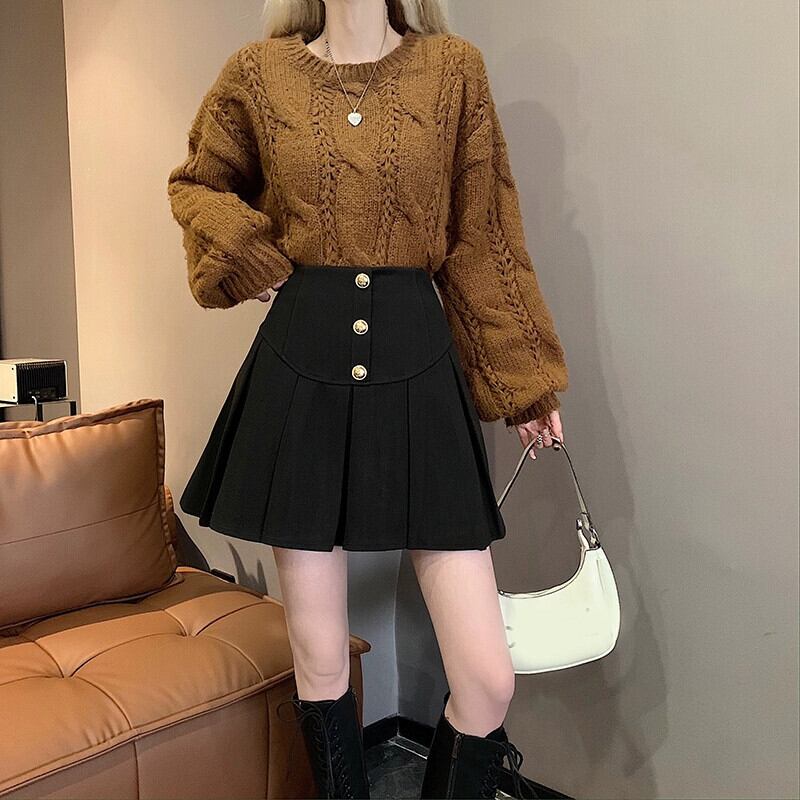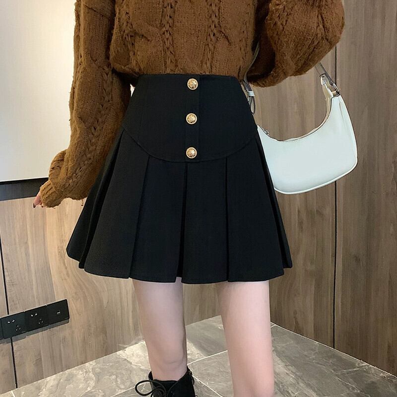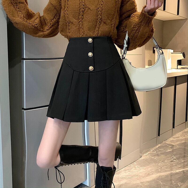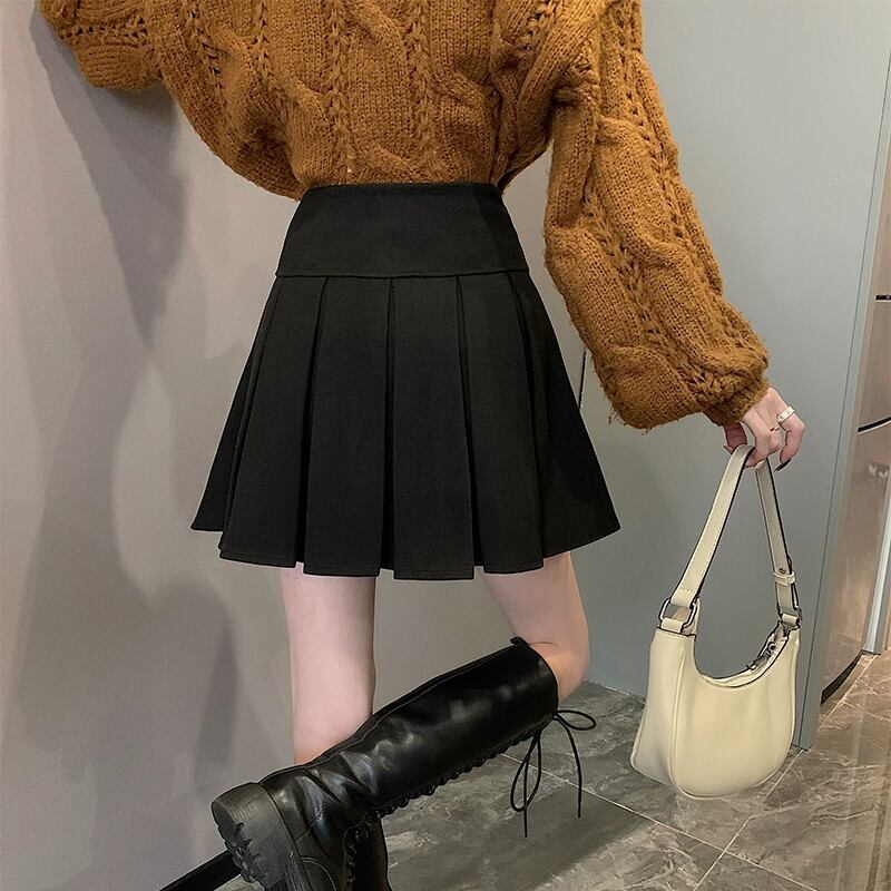 黒プリーツスカートの女性の秋のウールスカート 2023 新デザインハイウエスト A ラインショートスカート小人 ハイウェスト ブラック オータム 秋物 Aライン 8571676837003201