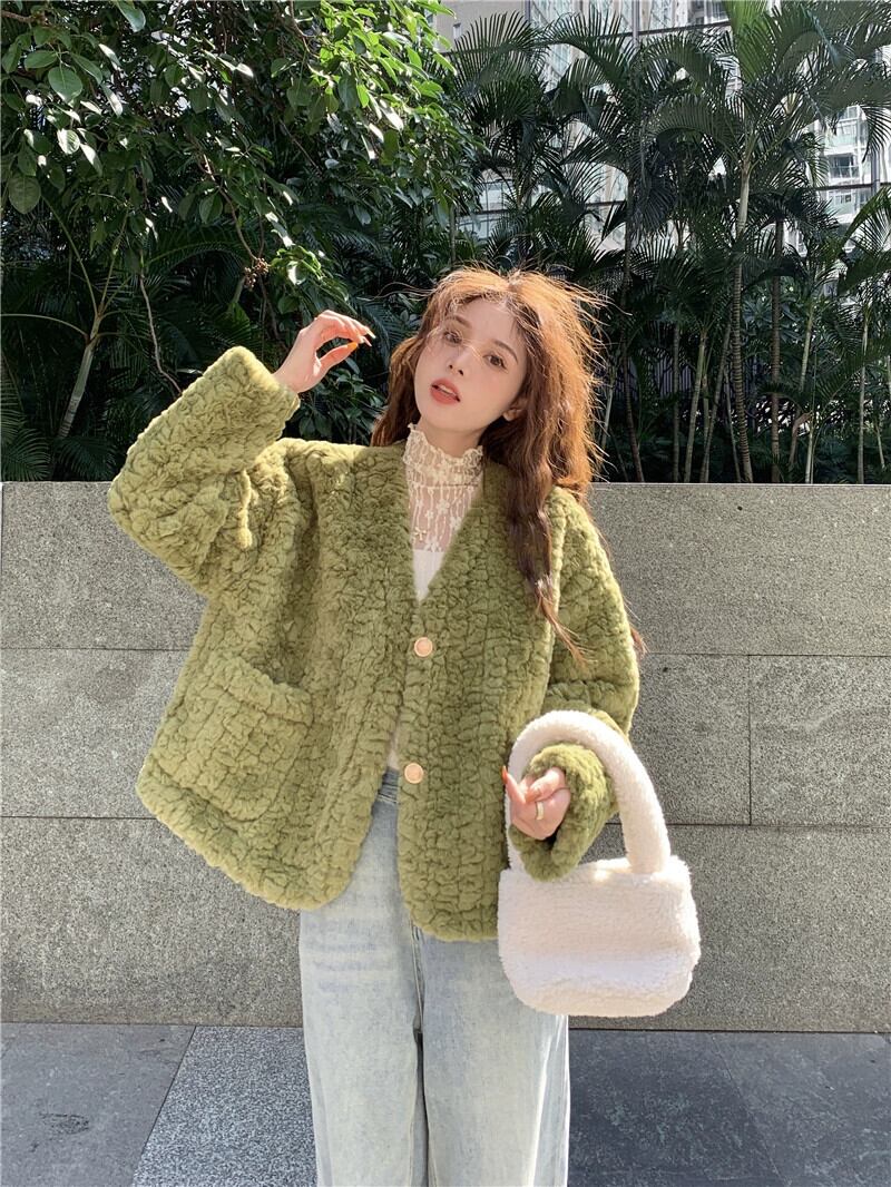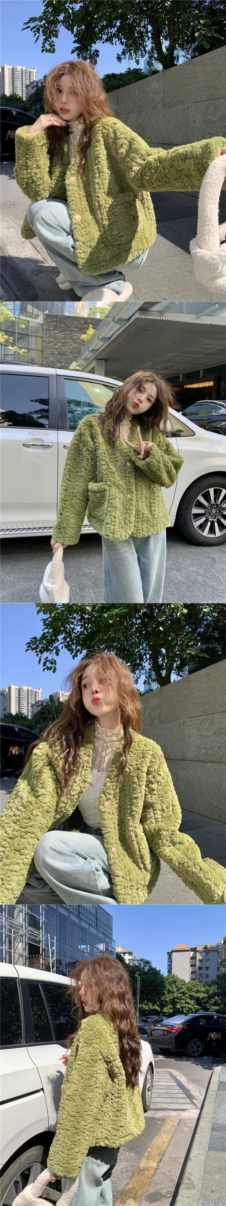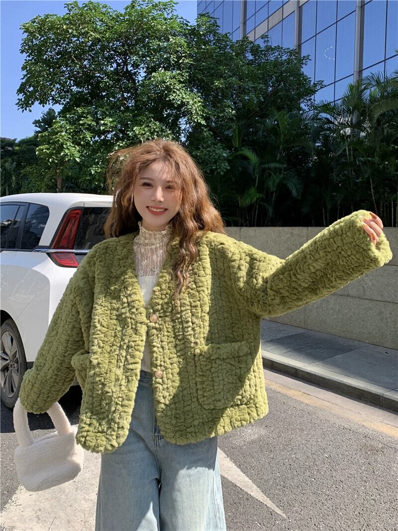 グリーンイミテーションラムウールジャケットレディースデザインニッチ秋冬フレンチスタイルプチハイエンドトップ オータム 秋物 ウィンター 冬物 8571664114523424