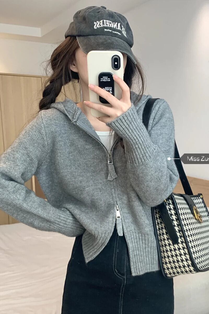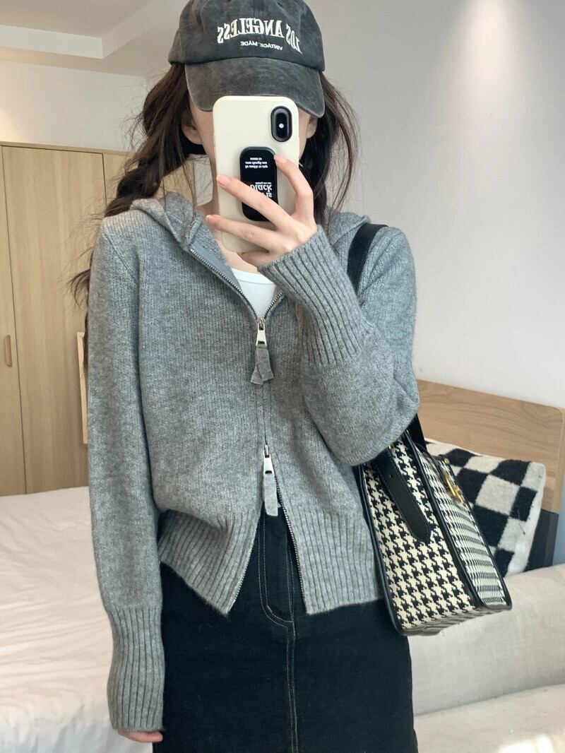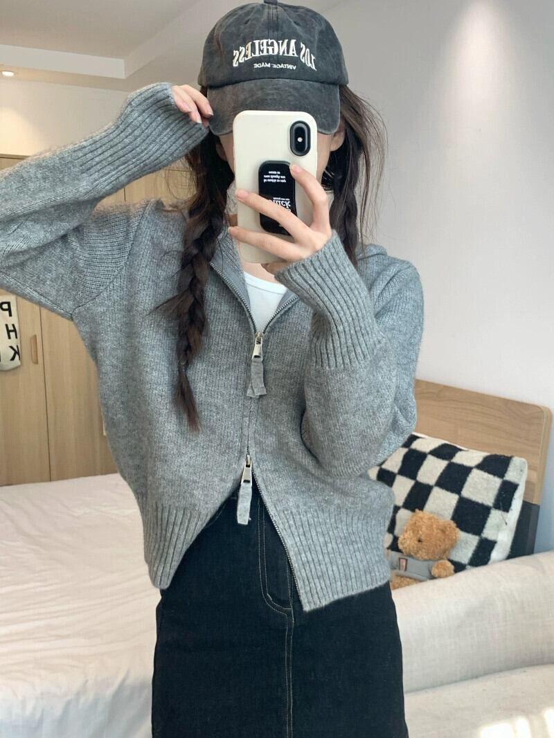 グレーのジッパーショートセータージャケット女性秋 2023 新デザインニッチシックなニットカーディガン オータム 秋物 8571680674147543