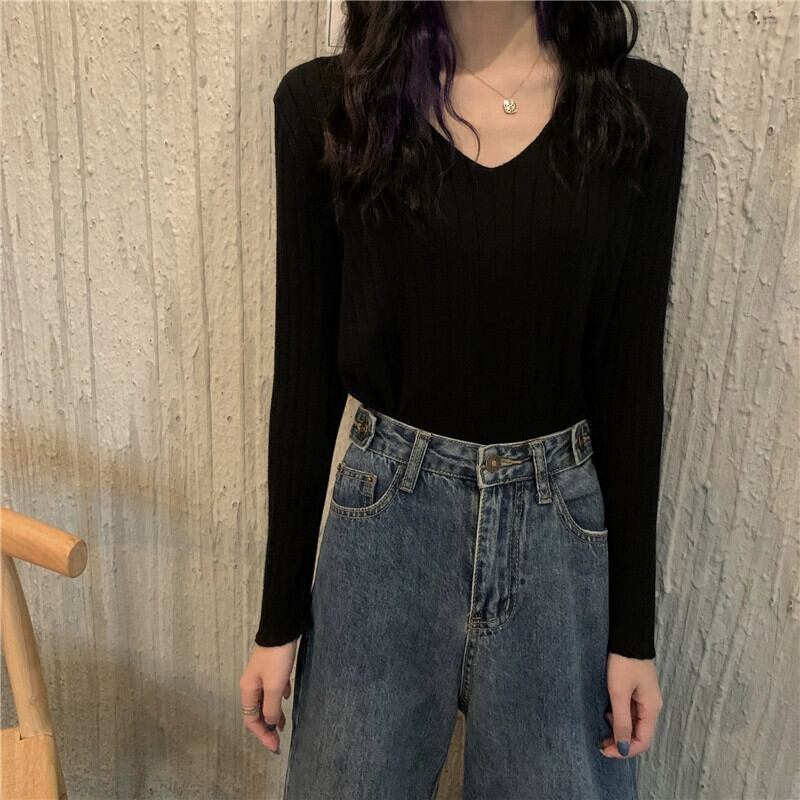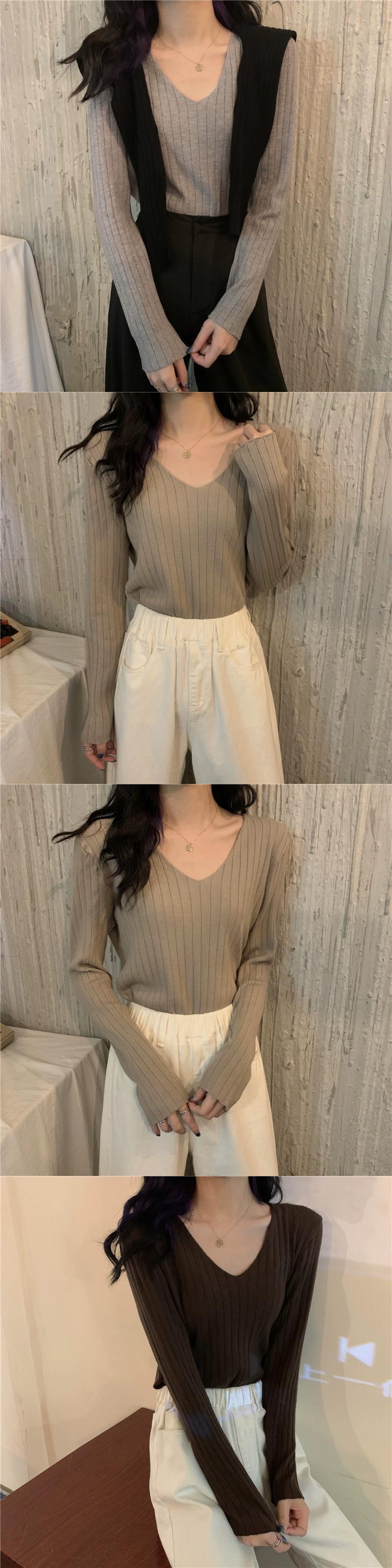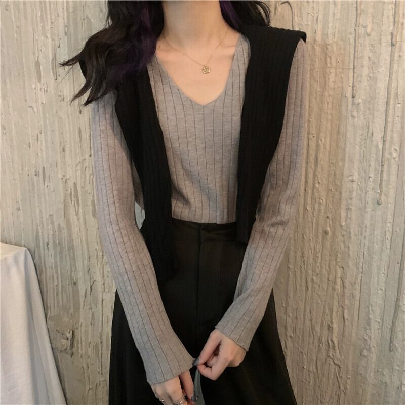 白いニットボトムシャツの女性、秋のハイエンドセーター、2023年の新しいスリムフィットVネックトップ ホワイト オータム 秋物 8571668465987052