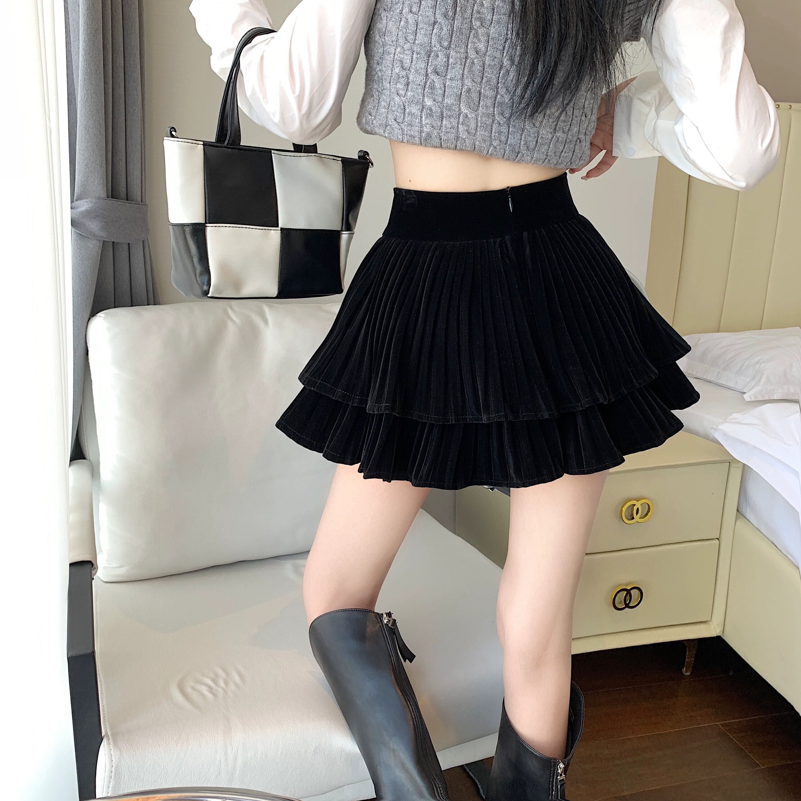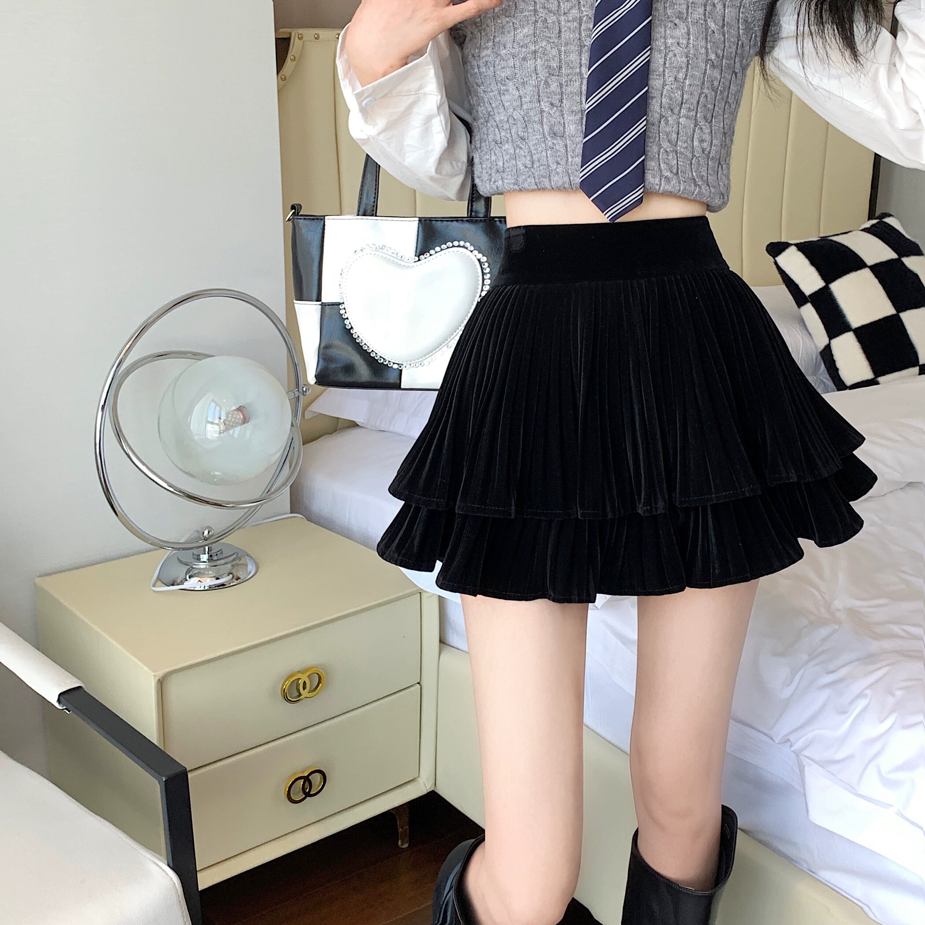 黒ベルベットふくらんスカート女性春と秋 2023 新しいハイウエストスリム A ラインスカート小人ショートスカート ブラック スプリング 春物 オータム 秋物 Aライン 8571625963507090