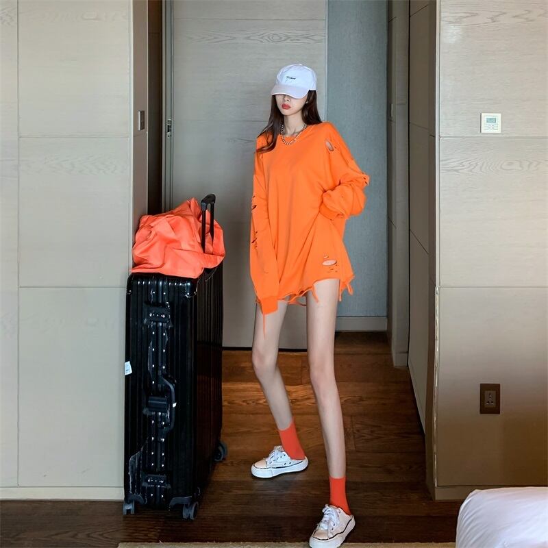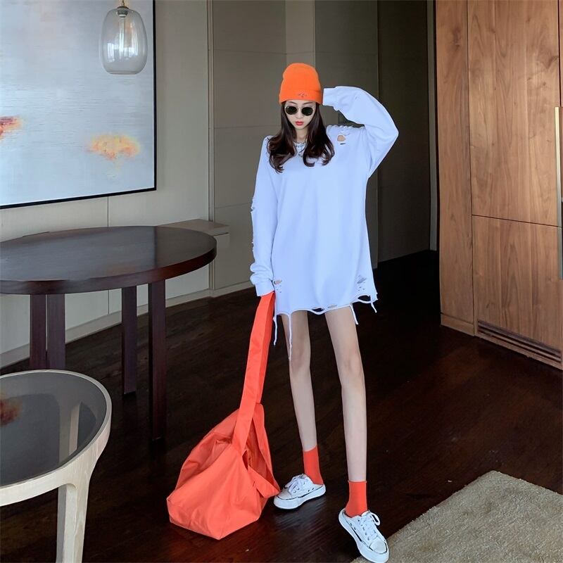 ニッチデザインの白い破れたミッドレングスのスウェットシャツの女性、2023年秋の新しいスタイルの怠惰なスタイルのルーズ長袖トップ ロング ホワイト オータム 秋物 8571676300745101