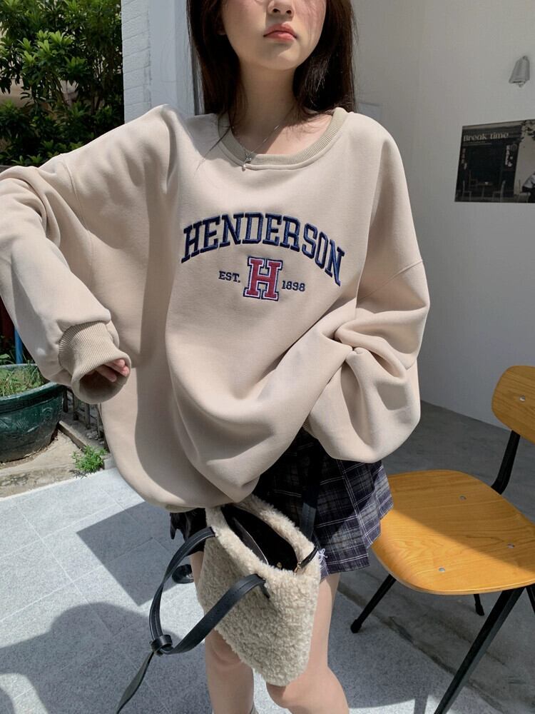 ミルキーブラウン ラウンドネック スウェットシャツ レディース 初秋 2023 新文字刺繍 アメリカンレトロ 怠惰なスタイル 長袖トップス ロング オータム 秋物 Oネック 8571644458337886