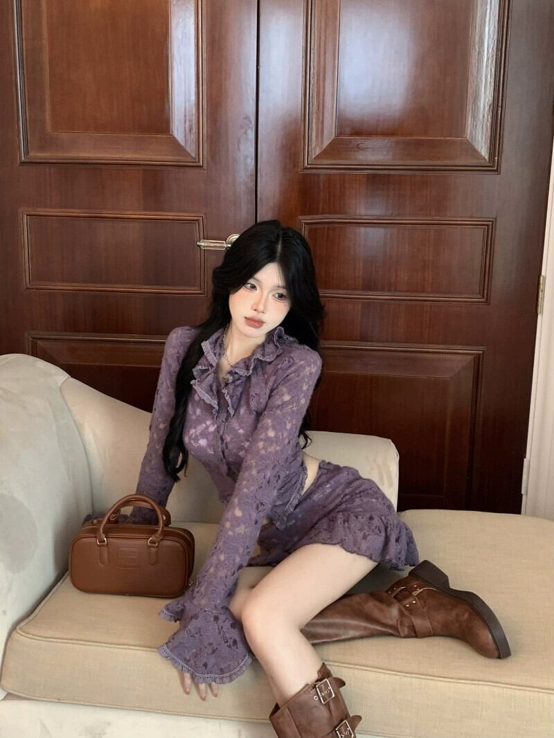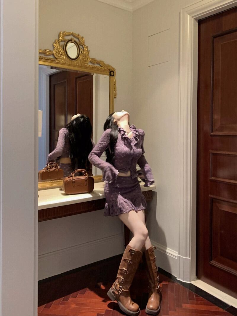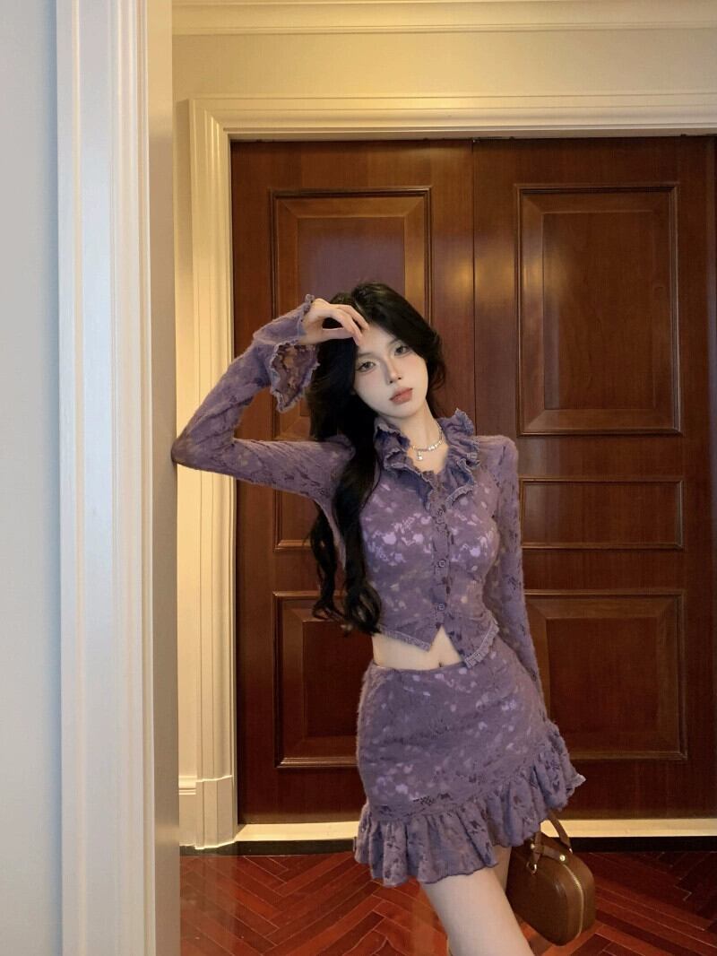 ニッチデザインのショート長袖トップス女性 2023 初秋の新しい純粋な欲望フレンチスタイルの美しい紫色のレースシャツ ロング オータム 秋物 ピュア パープル 8571671993978475