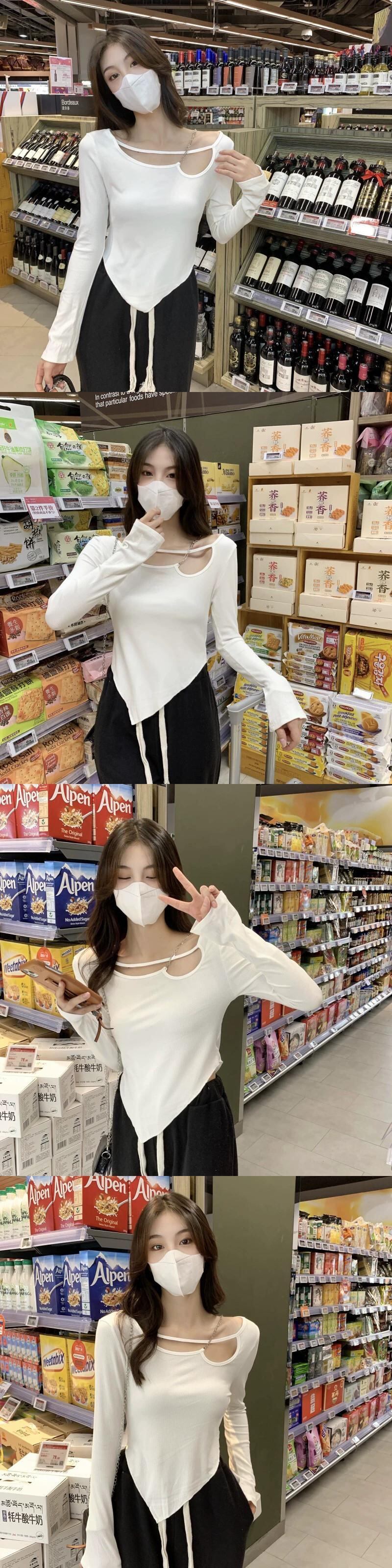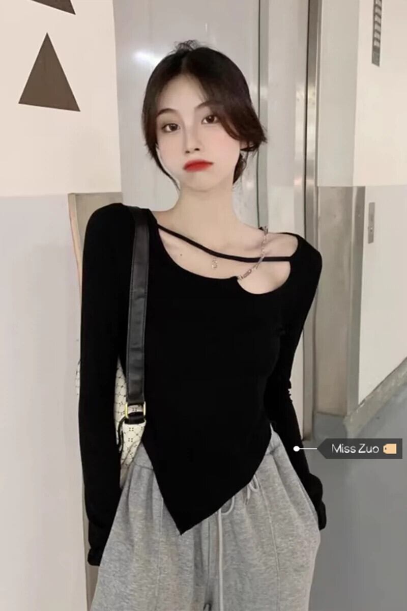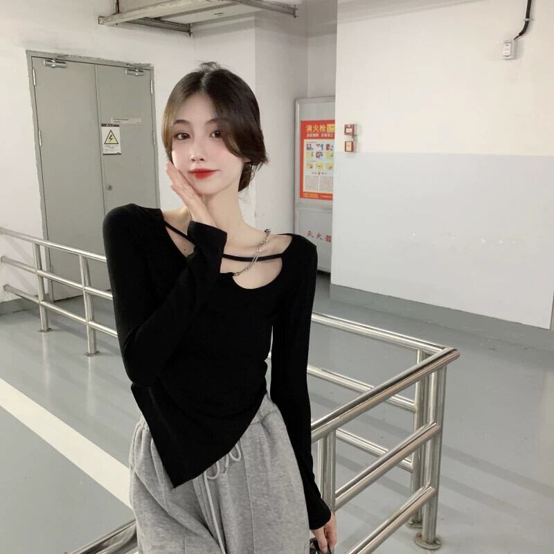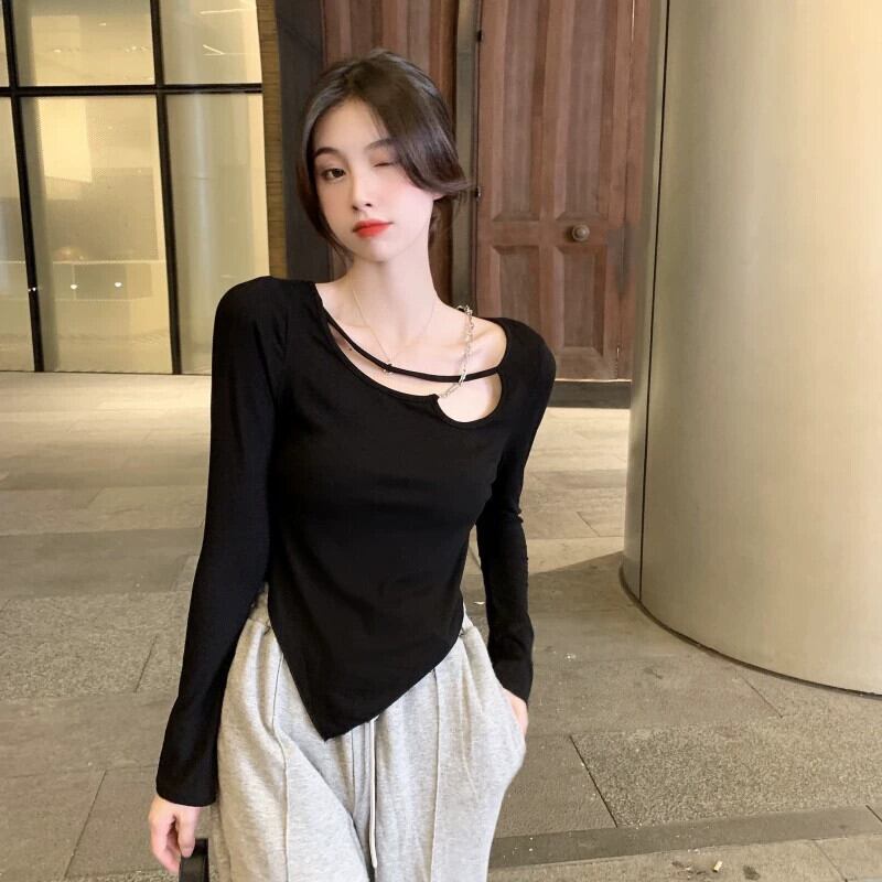 不規則な中空トップの女性、秋のインナーレイヤリングシャツ、純粋な欲望、慎重でシックな黒の長袖Tシャツ ロング ブラック オータム 秋物 ピュア 8571680883232666
