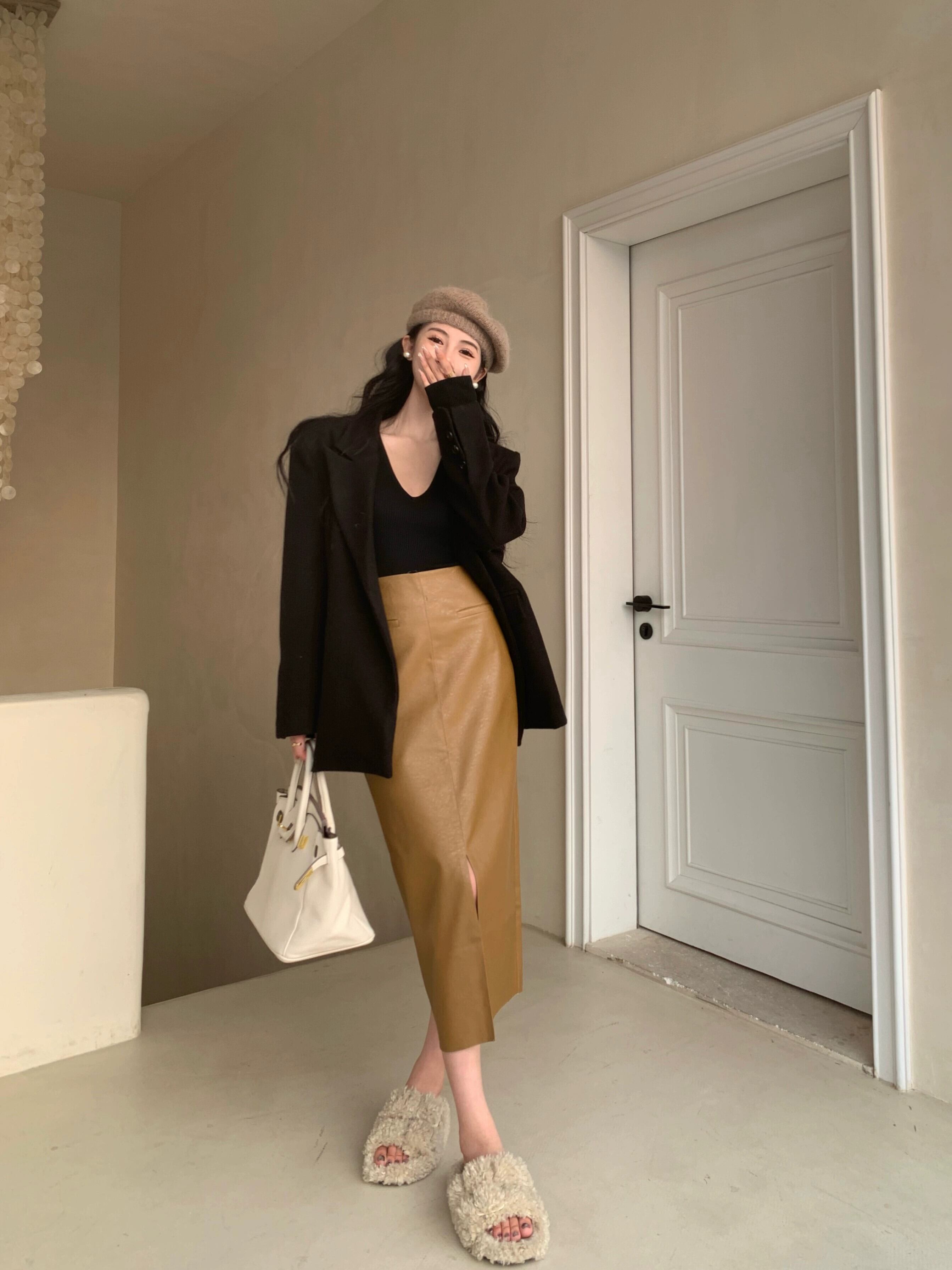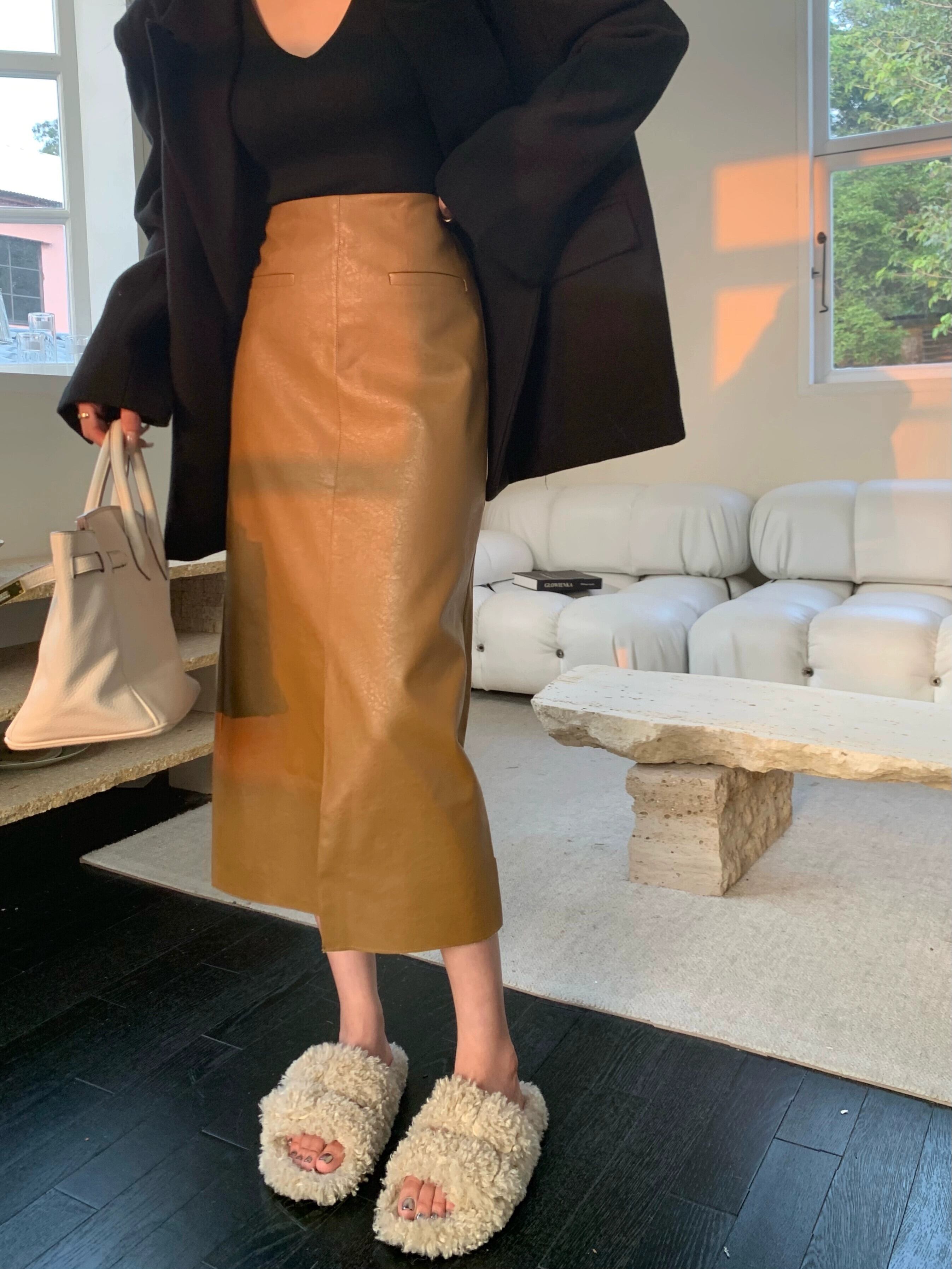 ブラウンレザースカートレディース秋ハイウエストスリットAラインスカートハイエンドで超見栄えの良いミドル丈のヒップハグスカート オータム 秋物 8571678455046570