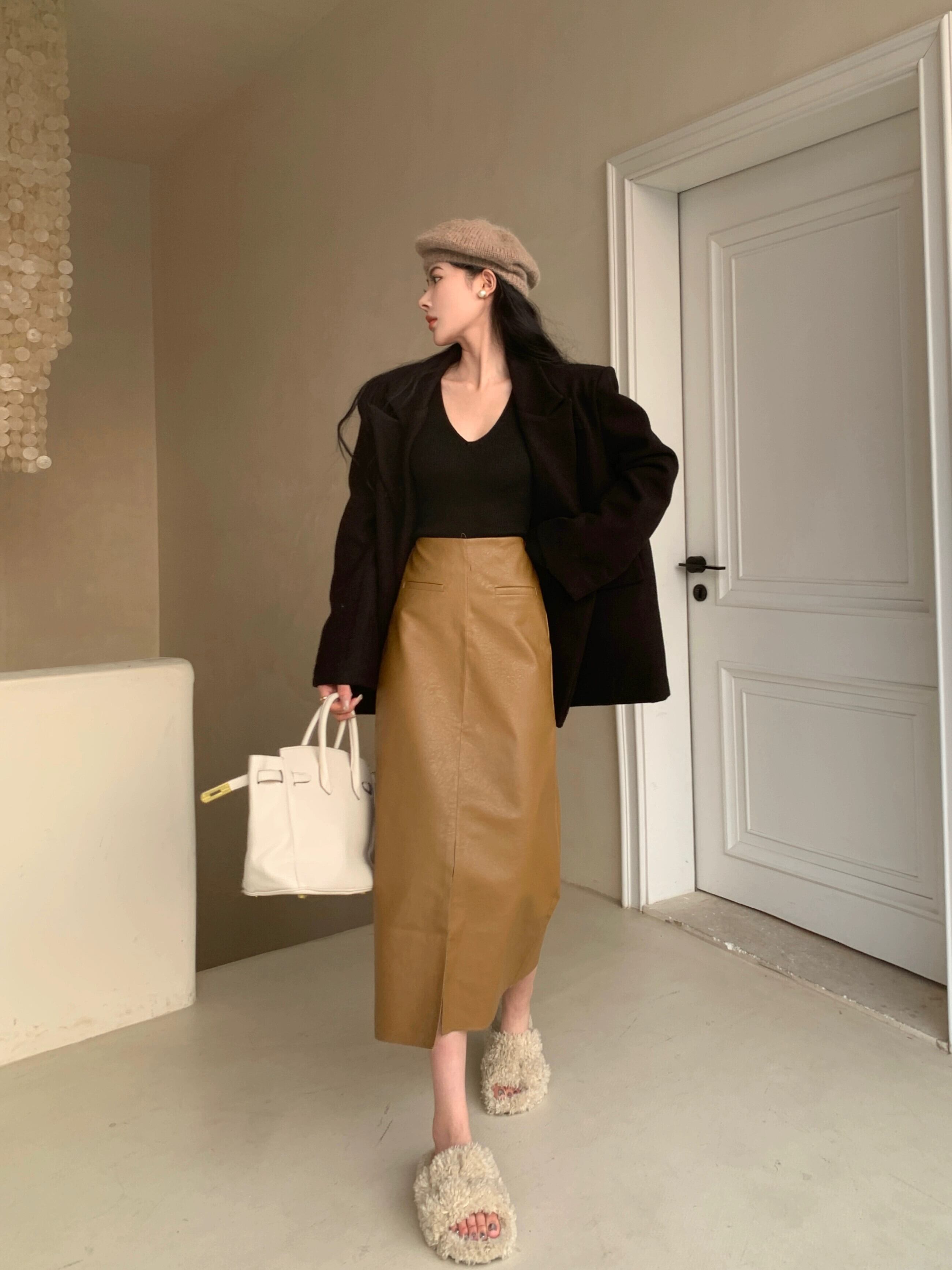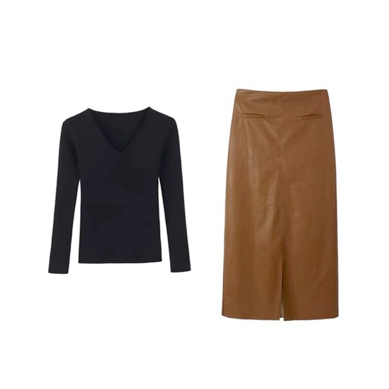 色:ブラックトップ,黒革のスカート,ブラウンレザースカート