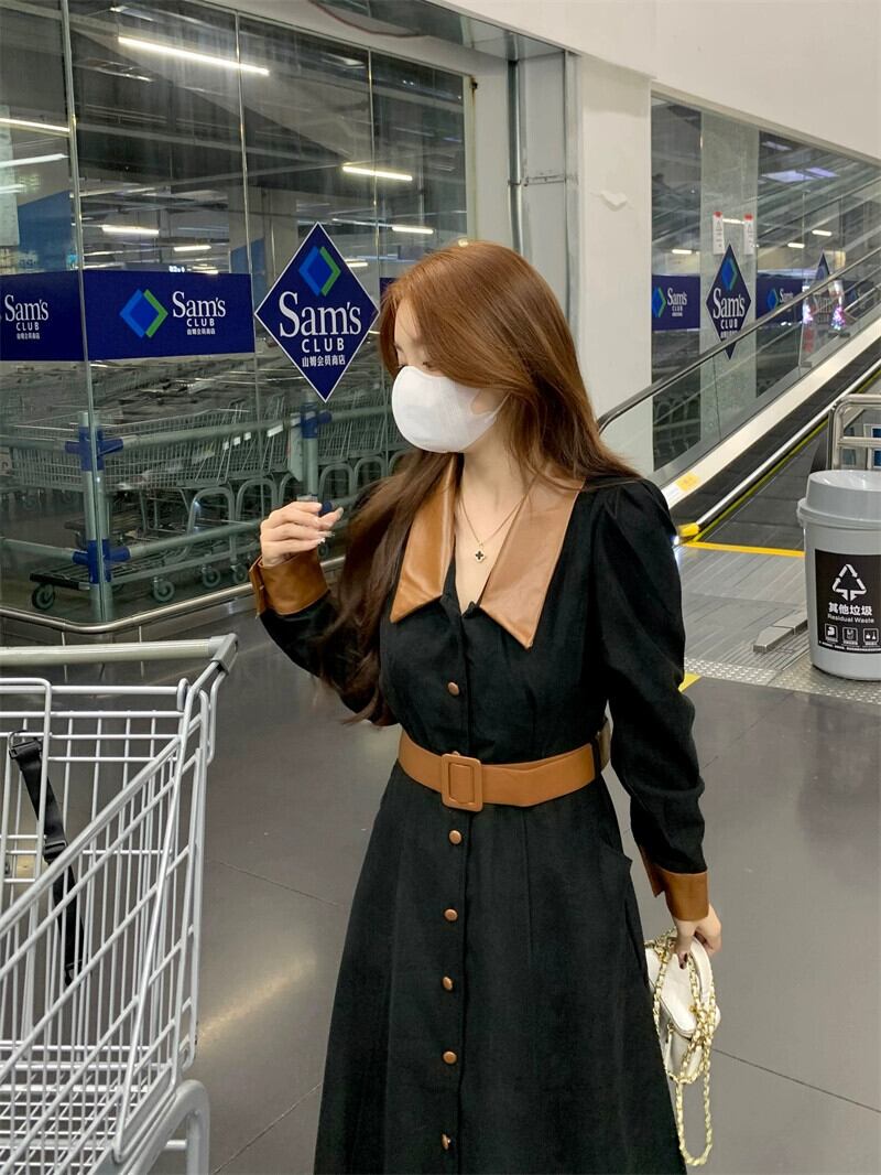 黒長袖ドレスの女性 2024 秋の新しいスタイルのフレンチレトロな気質ハイエンドウエスト痩身ロングスカート ブラック オータム 秋物 8571684780451593