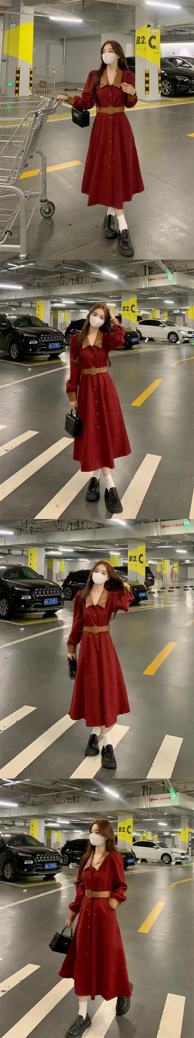 色:ベルト付きブラックドレス,ベルト付きバーガンディドレス