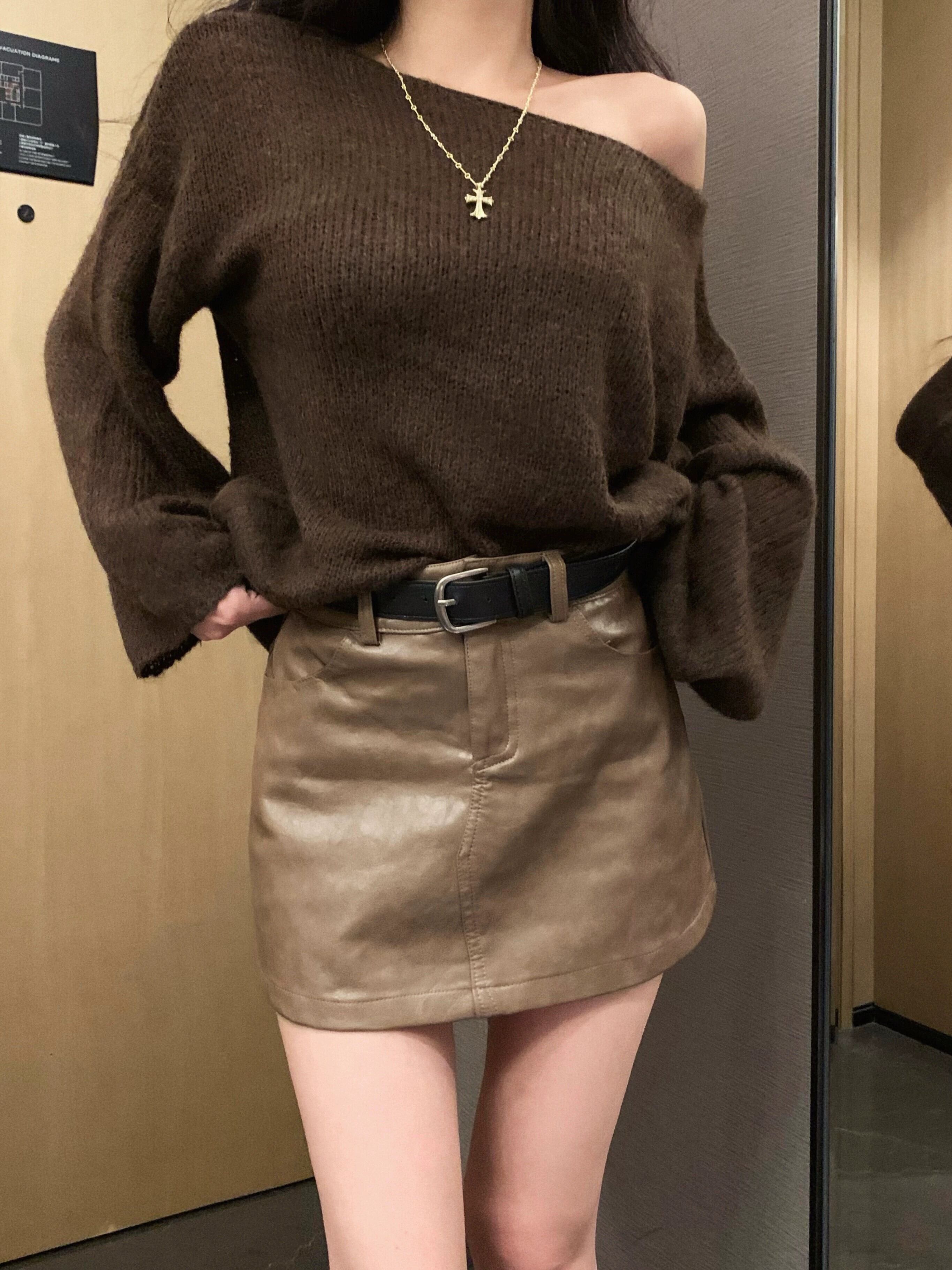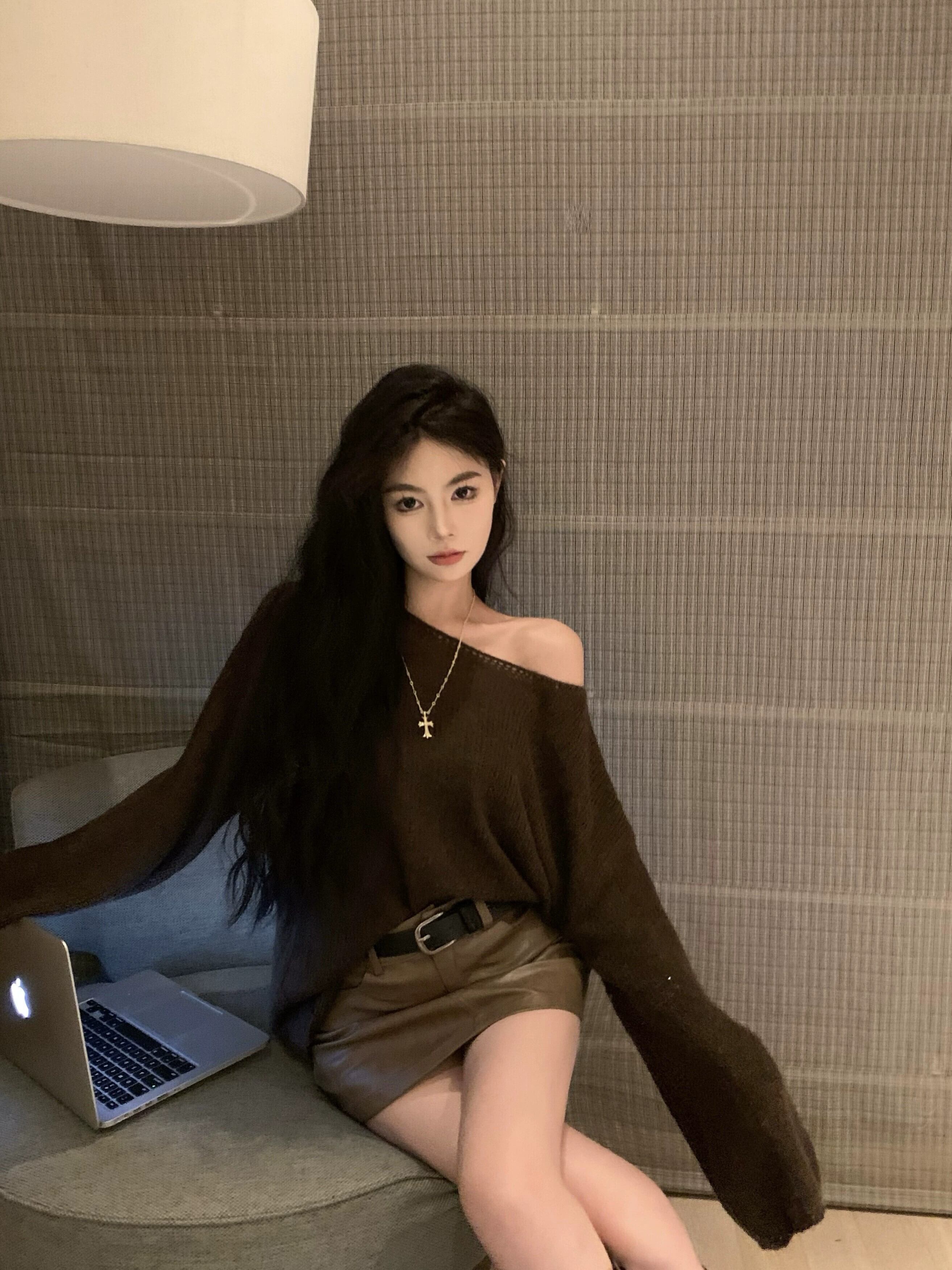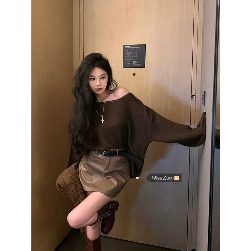 茶色のオフショルダー セーターの女性メイラード着用秋 2024 新しいレトロな怠惰なスタイルのルーズなデザイン トップ オータム 秋物 8571689236046228