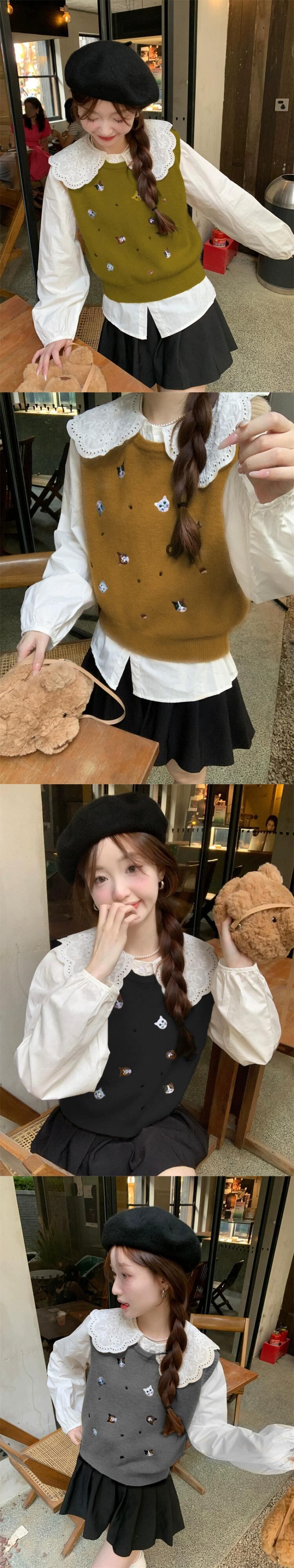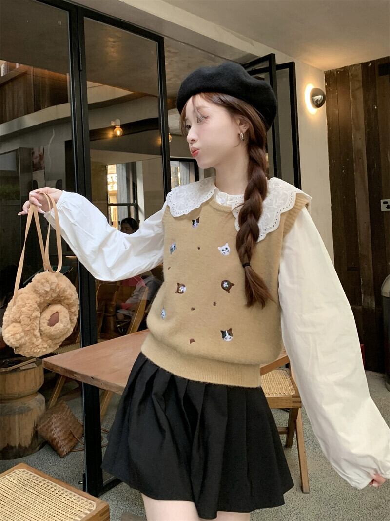 子猫刺繍ニットベスト女性秋シャツレイヤードセーターチョッキ甘い小さな男のベスト レッド 大人ガーリー スウィート キュート カジュアル オータム 秋物 8571631177085105