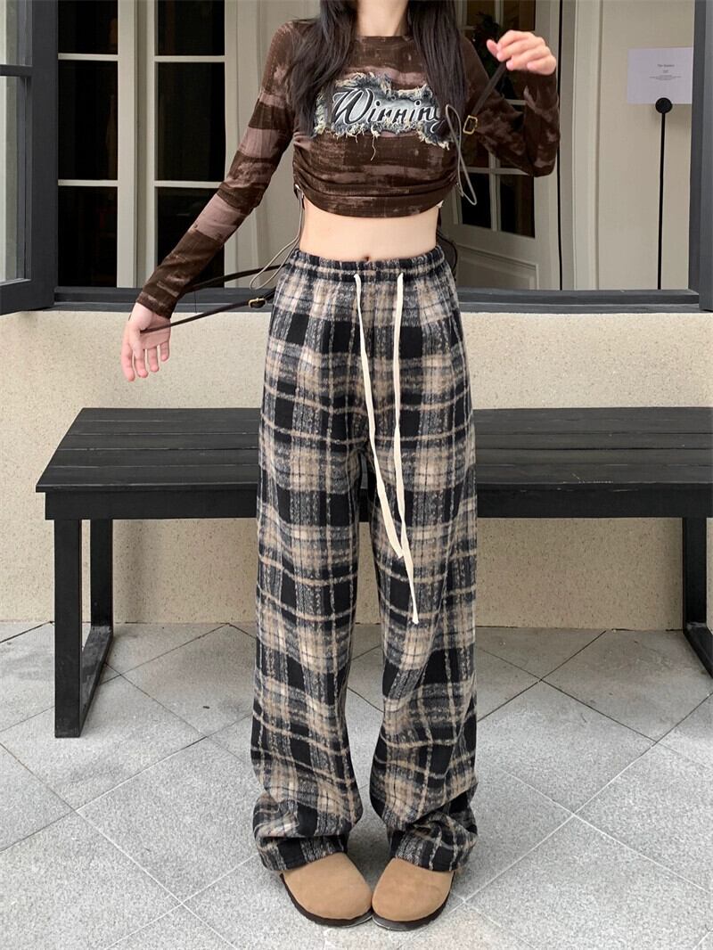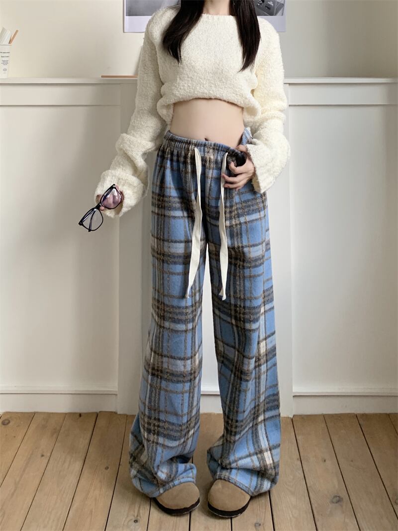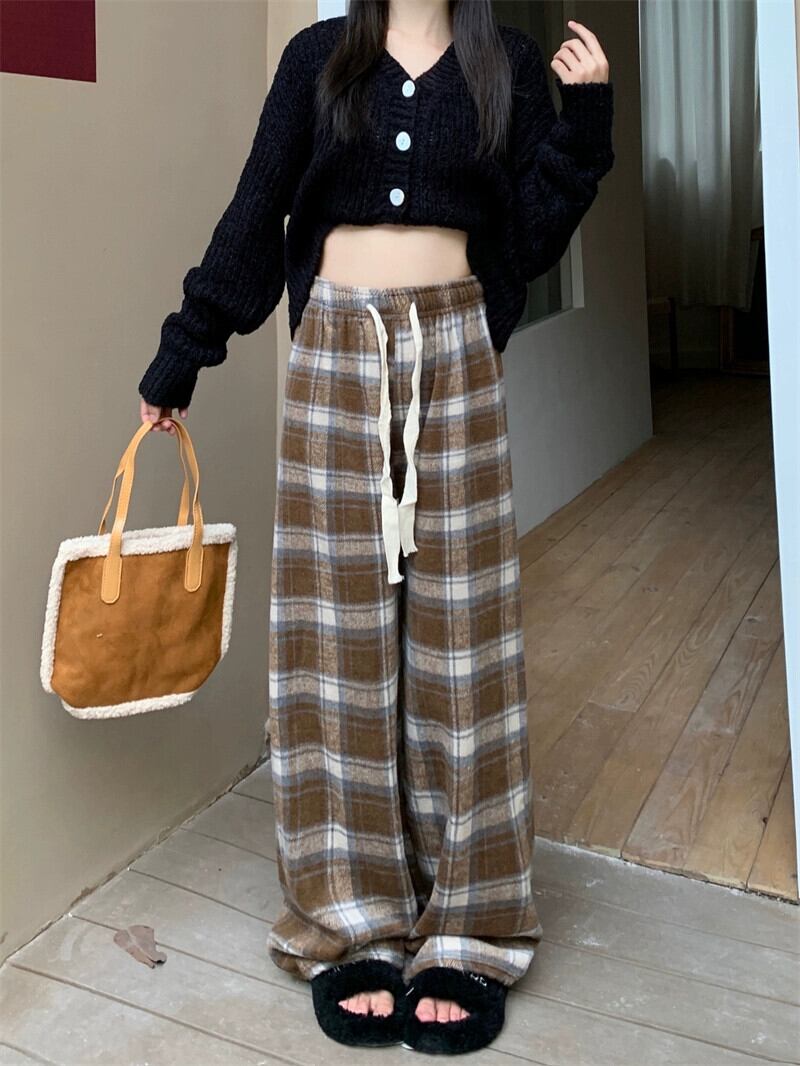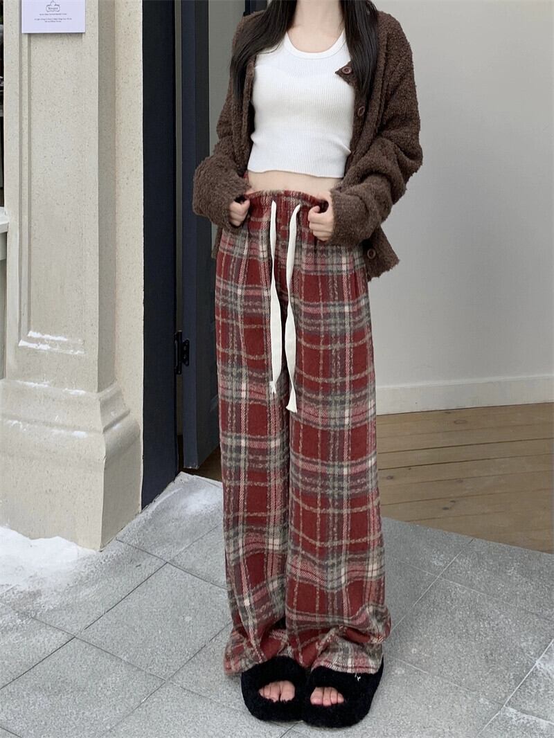 秋と冬のクリスマスレッドチェック柄パンツレディースプラスベルベットと厚みのあるハイウエストナローワイドレッグパンツレトロカジュアルフロアレングスパンツ オータム 秋物 ウィンター 冬物 8571669666411522