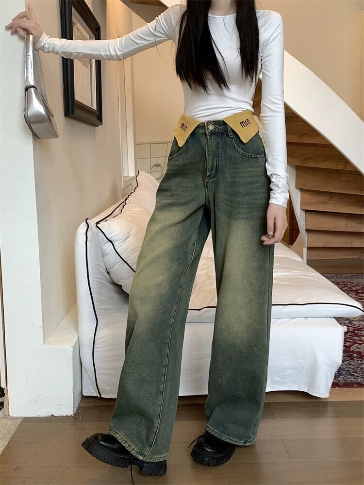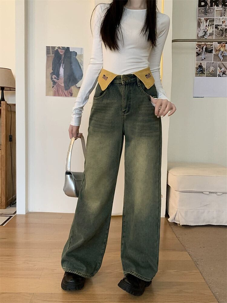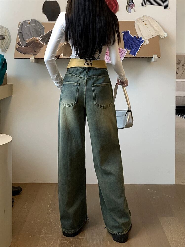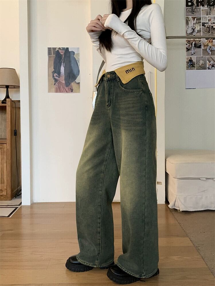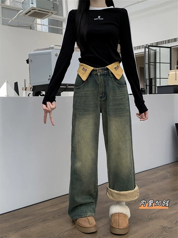 ベルベット肥厚ジーンズ女性の秋と冬のハイウエスト痩身ワイドレッグパンツ 2024 新しいアメリカンレトロフロアレングスパンツ ハイウェスト オータム 秋物 ウィンター 冬物 ワイドパンツ 8571687843606858