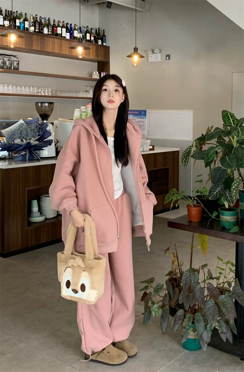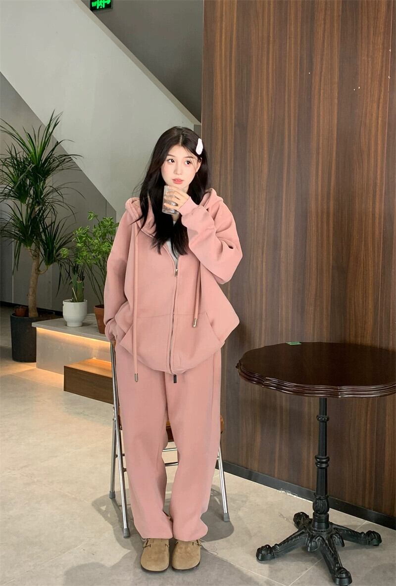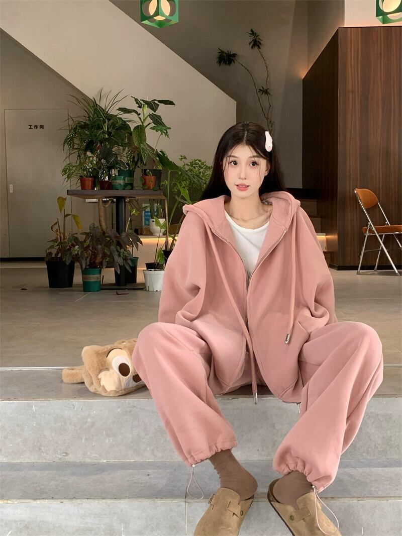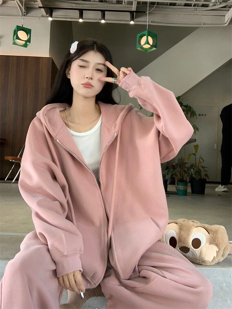 秋と冬のピンクのカジュアルスポーツスウェットシャツジャケットレディースプラスベルベットと厚みのあるアメリカンスタイルの怠惰なスタイルのミッドレングスのフード付きトップ オータム 秋物 ウィンター 冬物 8571662878476782