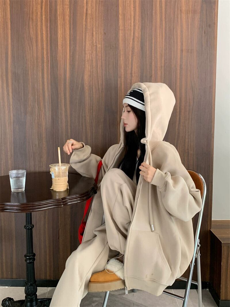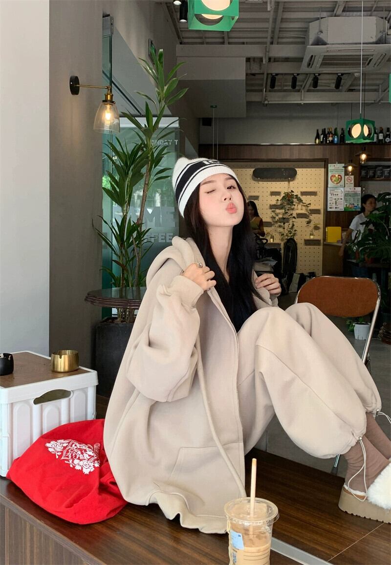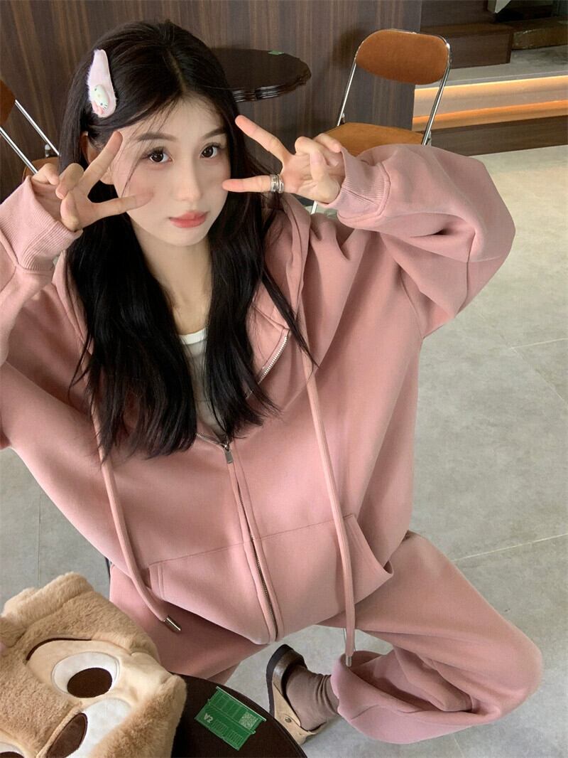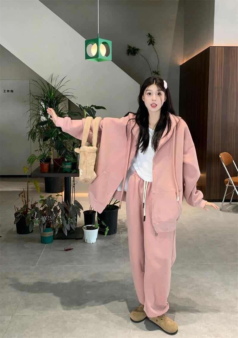秋と冬のピンクのカジュアルスポーツスウェットシャツジャケットレディースプラスベルベットと厚みのあるアメリカンスタイルの怠惰なスタイルのミッドレングスのフード付きトップ オータム 秋物 ウィンター 冬物 8571662878476782