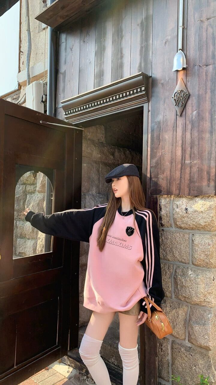 秋冬のコントラストカラーのラグラン長袖スウェットシャツレディースプラスベルベットと厚みのあるアメリカンレトロ怠惰なスタイルのスリーストライプスラウンドネックトップトレンディ ロング オータム 秋物 ウィンター 冬物 Oネック 8571666744790393