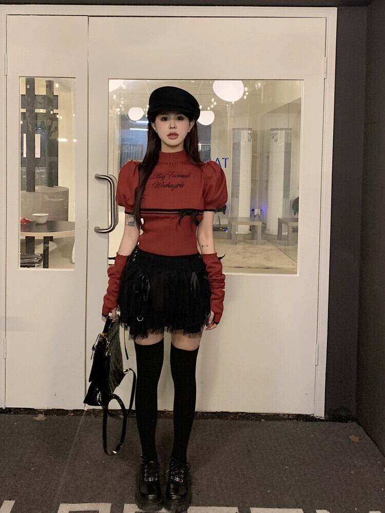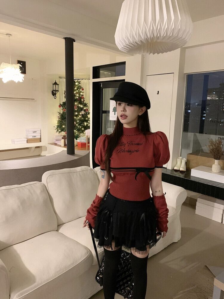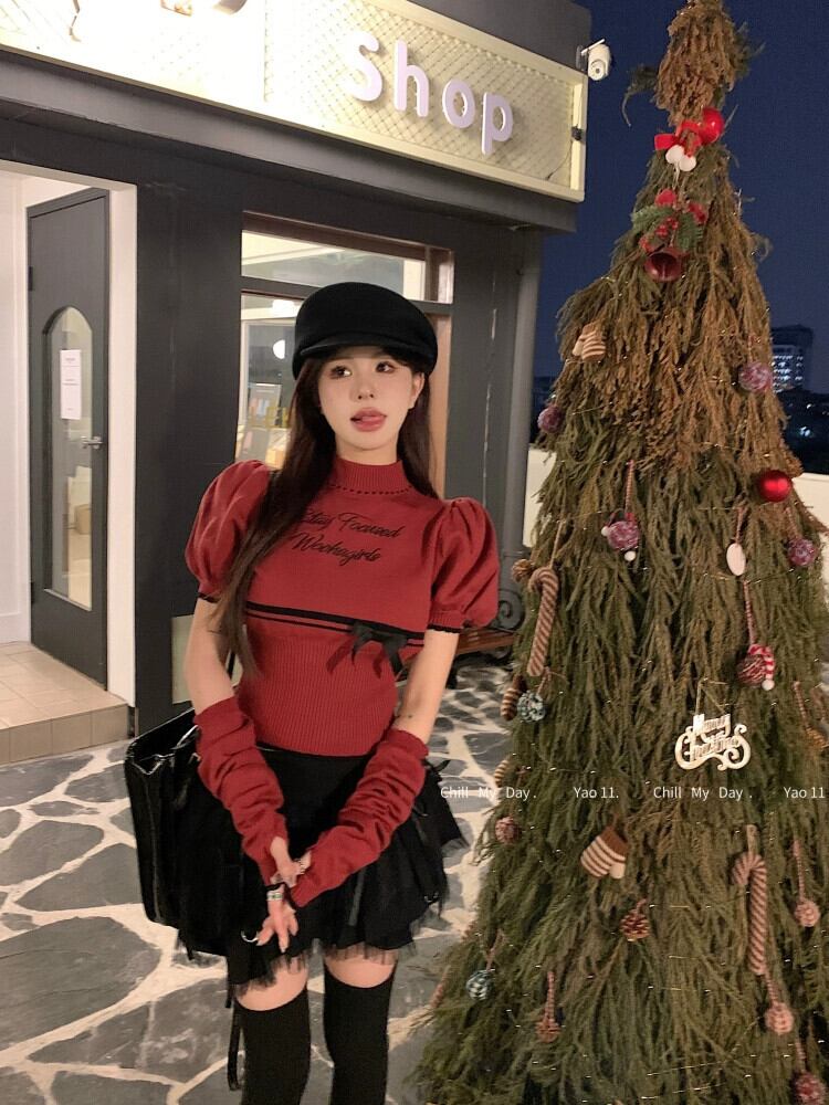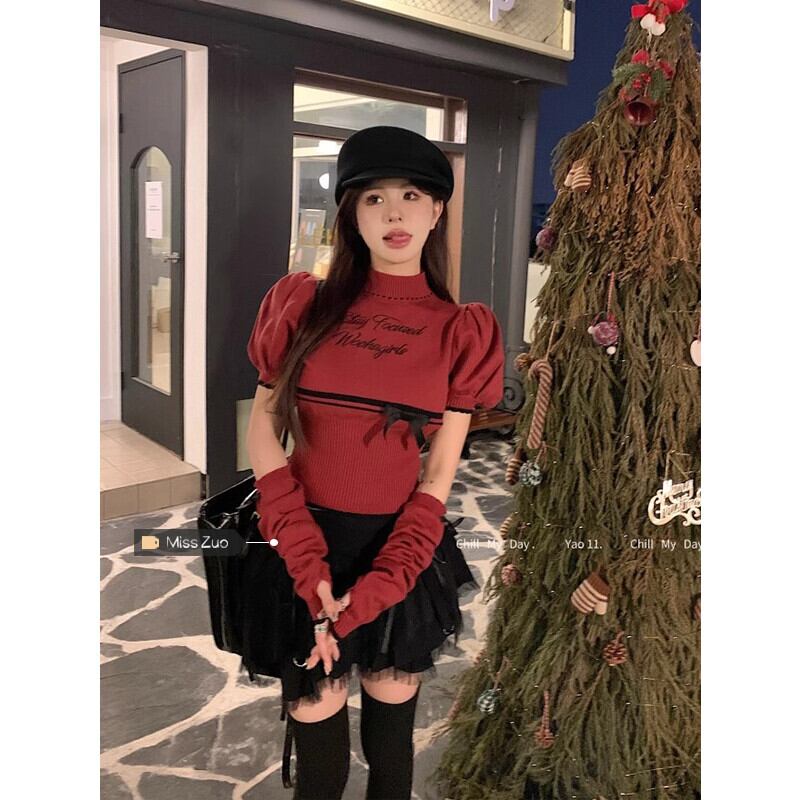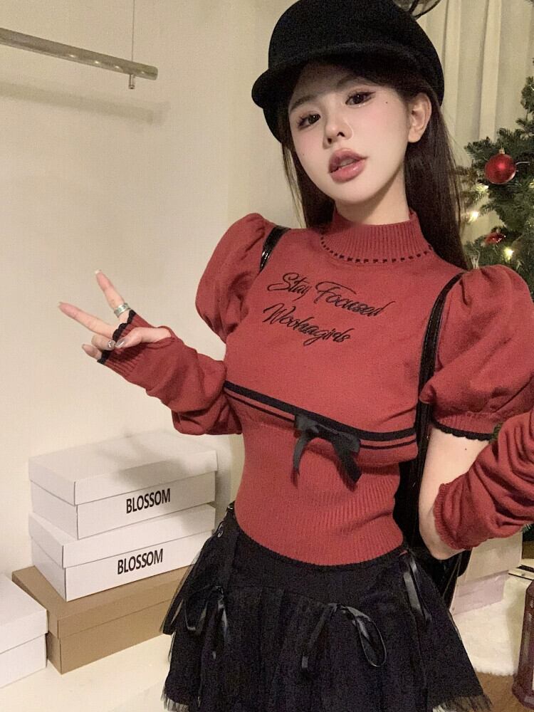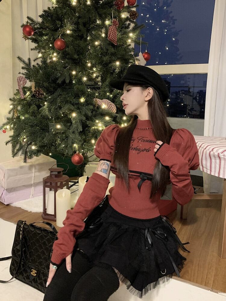 クリスマスレッドセーター女性の秋と冬ボトリングクロップトップホットガールシックでユニークなスプリットスリーブスリーブセーター オータム 秋物 ウィンター 冬物 8571633931323935