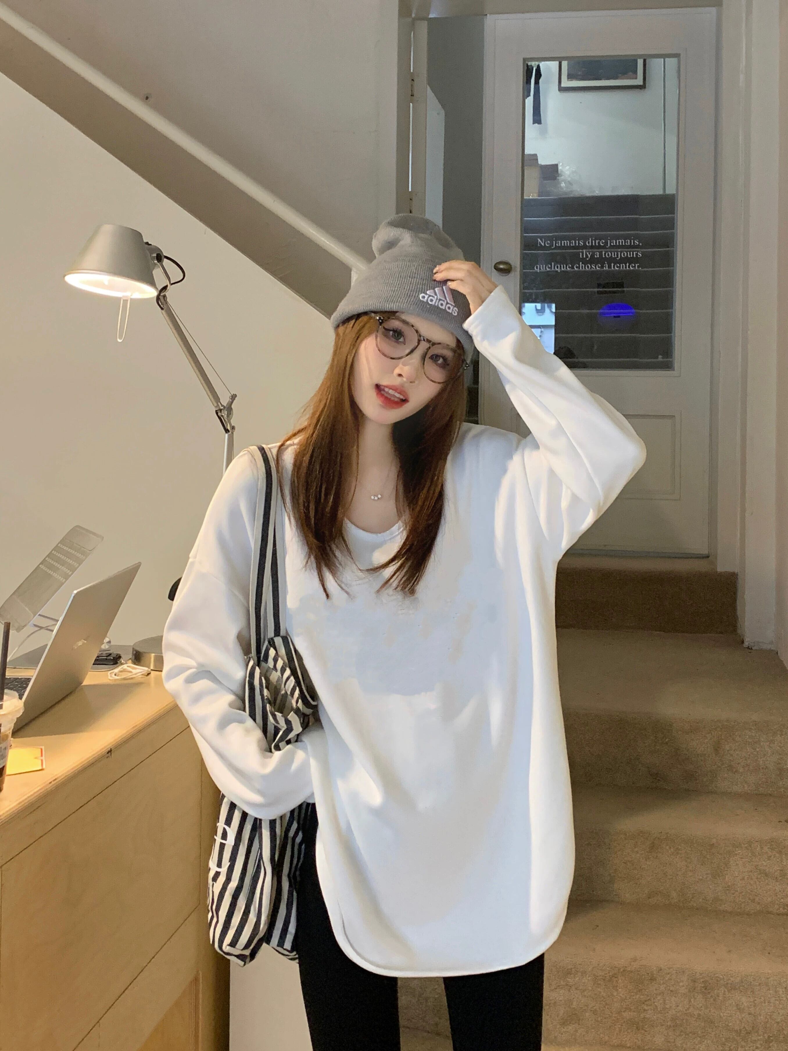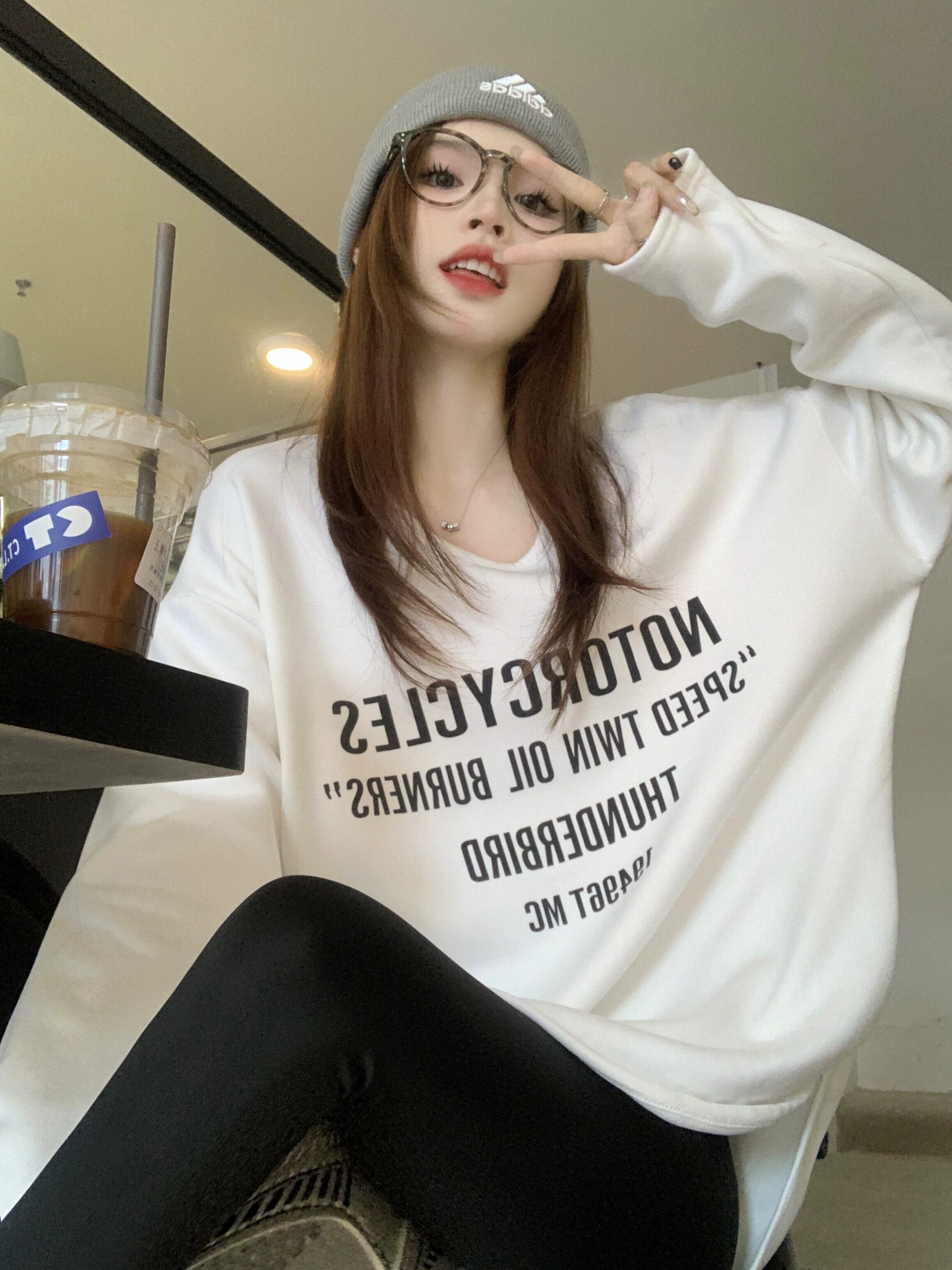 秋冬の白い長袖Tシャツの女性、ベルベットの厚いインナーボトムシャツ、レタープリントのウエスタンスタイルのミドル丈のトップス ロング ホワイト オータム 秋物 ウィンター 冬物 8571693279244670