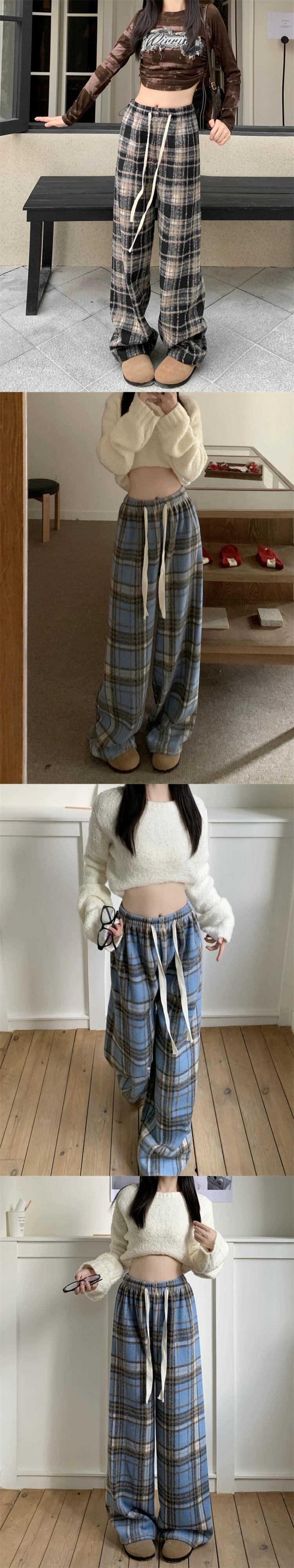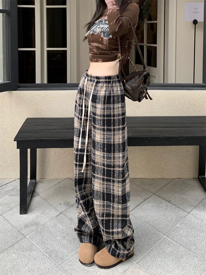 秋と冬の赤いチェック柄パンツ女性プラスベルベットと厚みのあるウールのワイドレッグパンツハイウエストストレートレトロカジュアルフロアレングスパンツ レッド オータム 秋物 ウィンター 冬物 8571685837865602