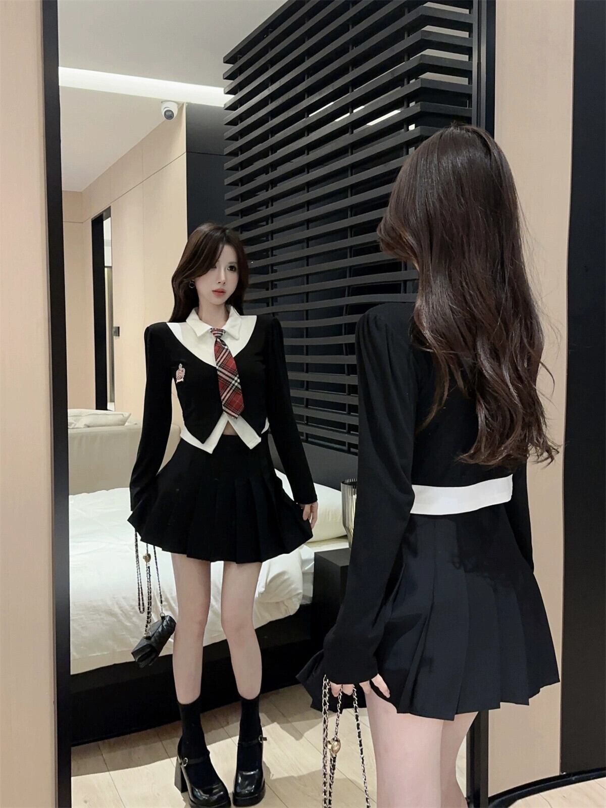 色:フェイクツートップにはネクタイが付属します,ブラックプリーツスカート