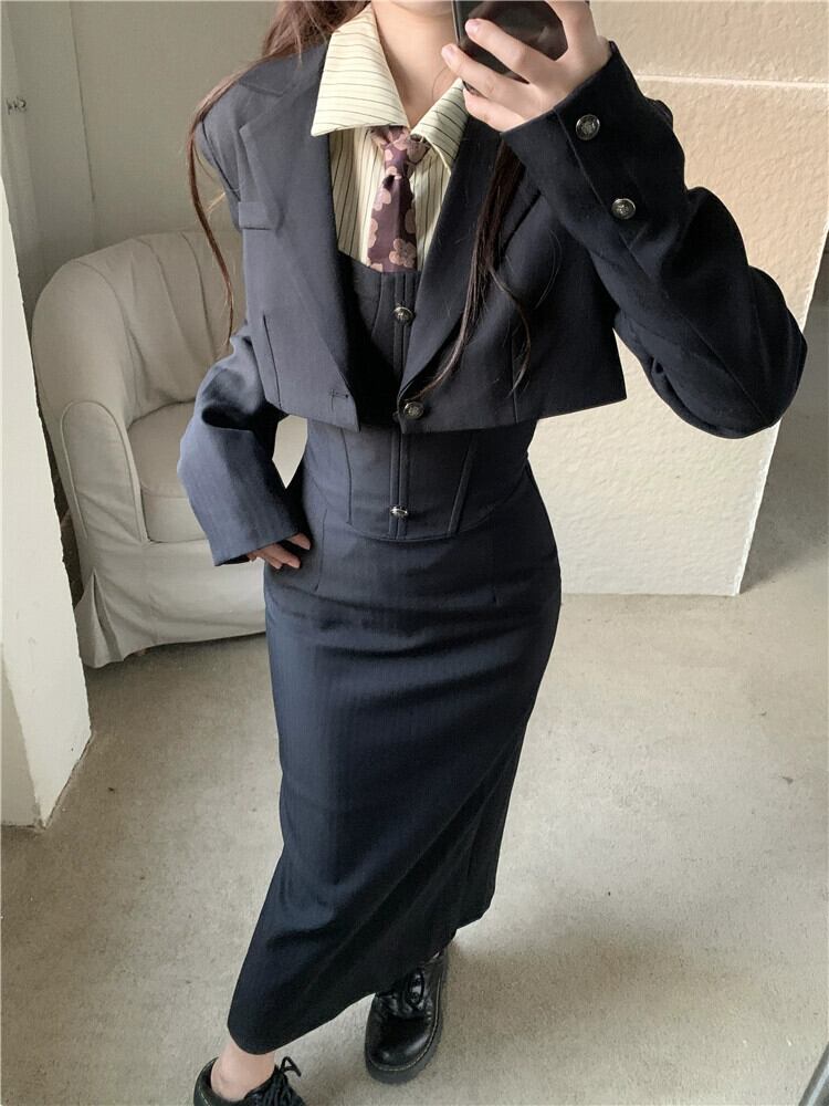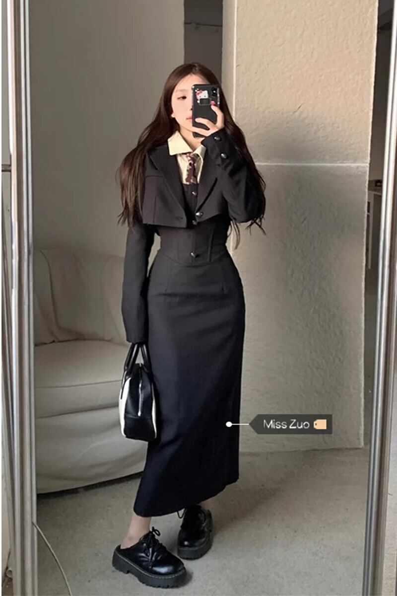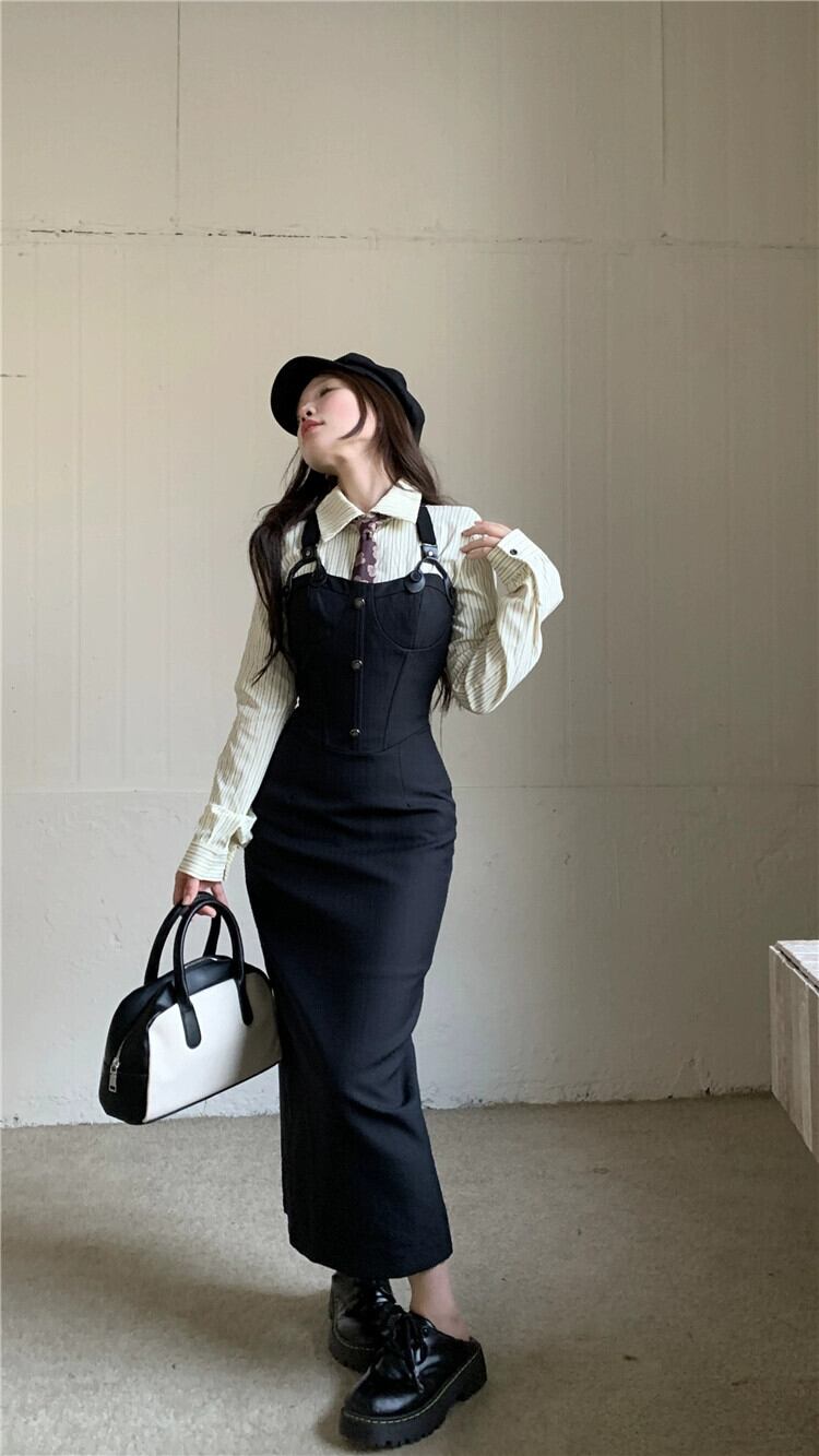 色:アプリコットシャツ(ネクタイ付き),ブラックストラップドレス,黒のブレザー