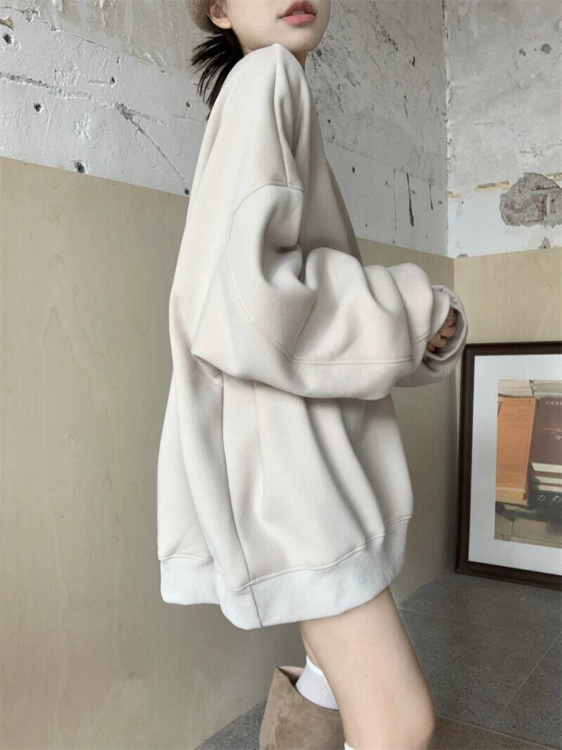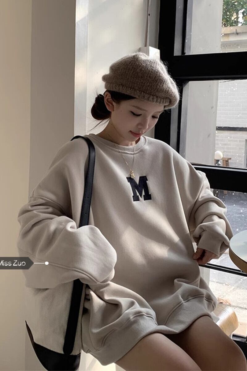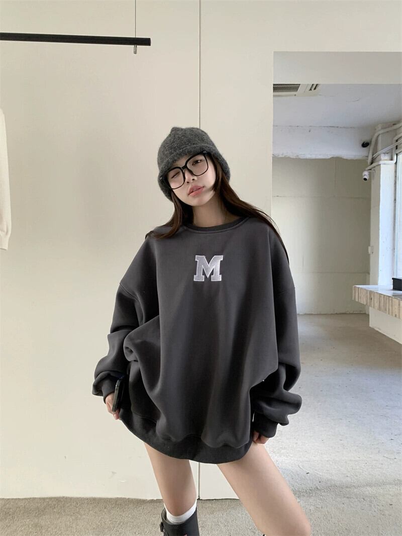 ミルクグレーのラウンドネックスウェットシャツの女性の秋と冬のベルベット肥厚特大怠惰なスタイルのミッドレングスの文字刺繍トップ レッド オータム 秋物 ウィンター 冬物 Oネック 8571660112623645