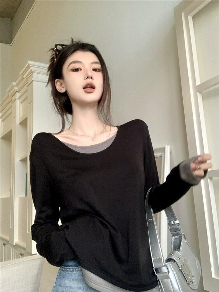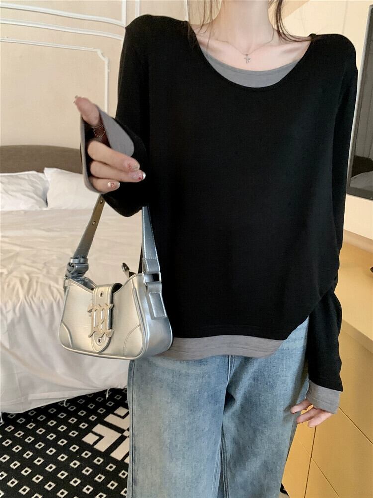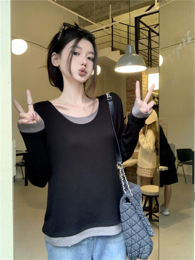 コントラストカラーフェイクツーピース長袖 Tシャツ女性の秋と冬のインナーレイヤリングシャツデザインセンスプラスサイズ脂肪 mm 痩身シックなトップ ロング 大きめサイズ オータム 秋物 ウィンター 冬物 8571698754361873