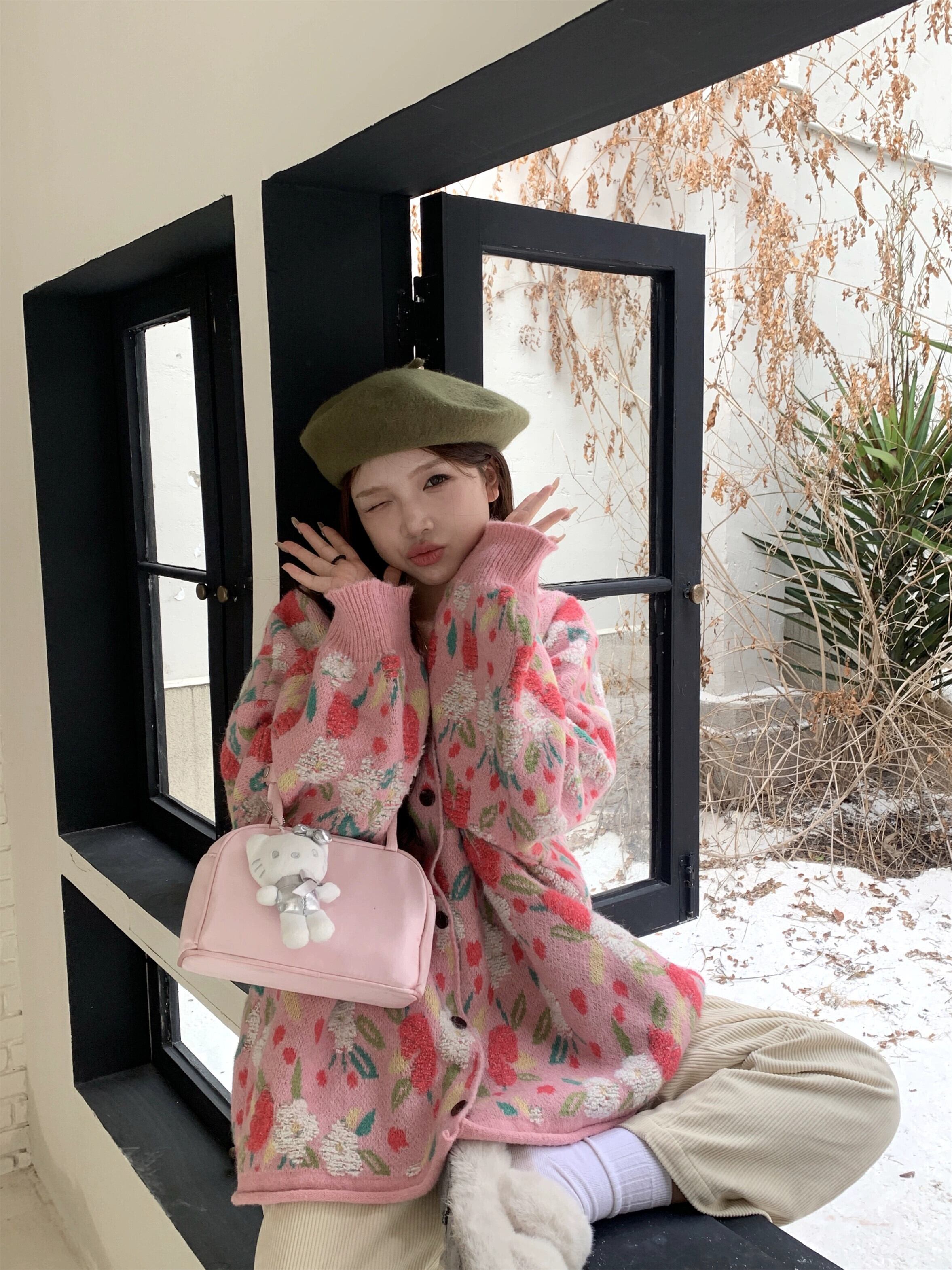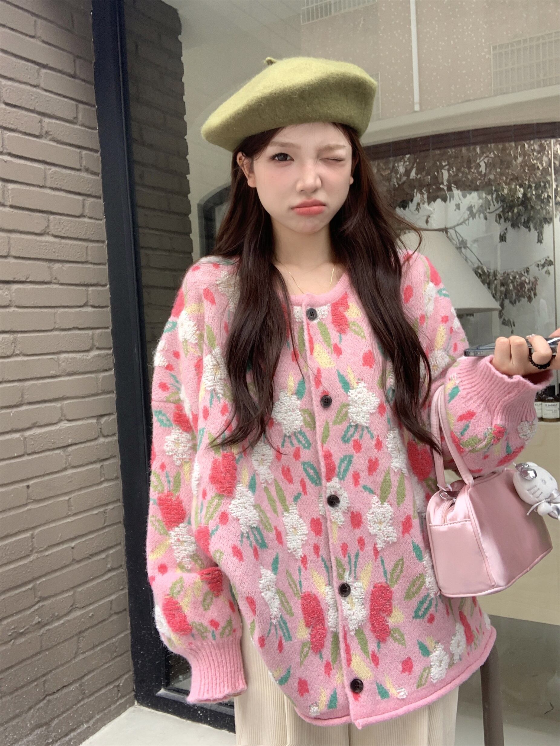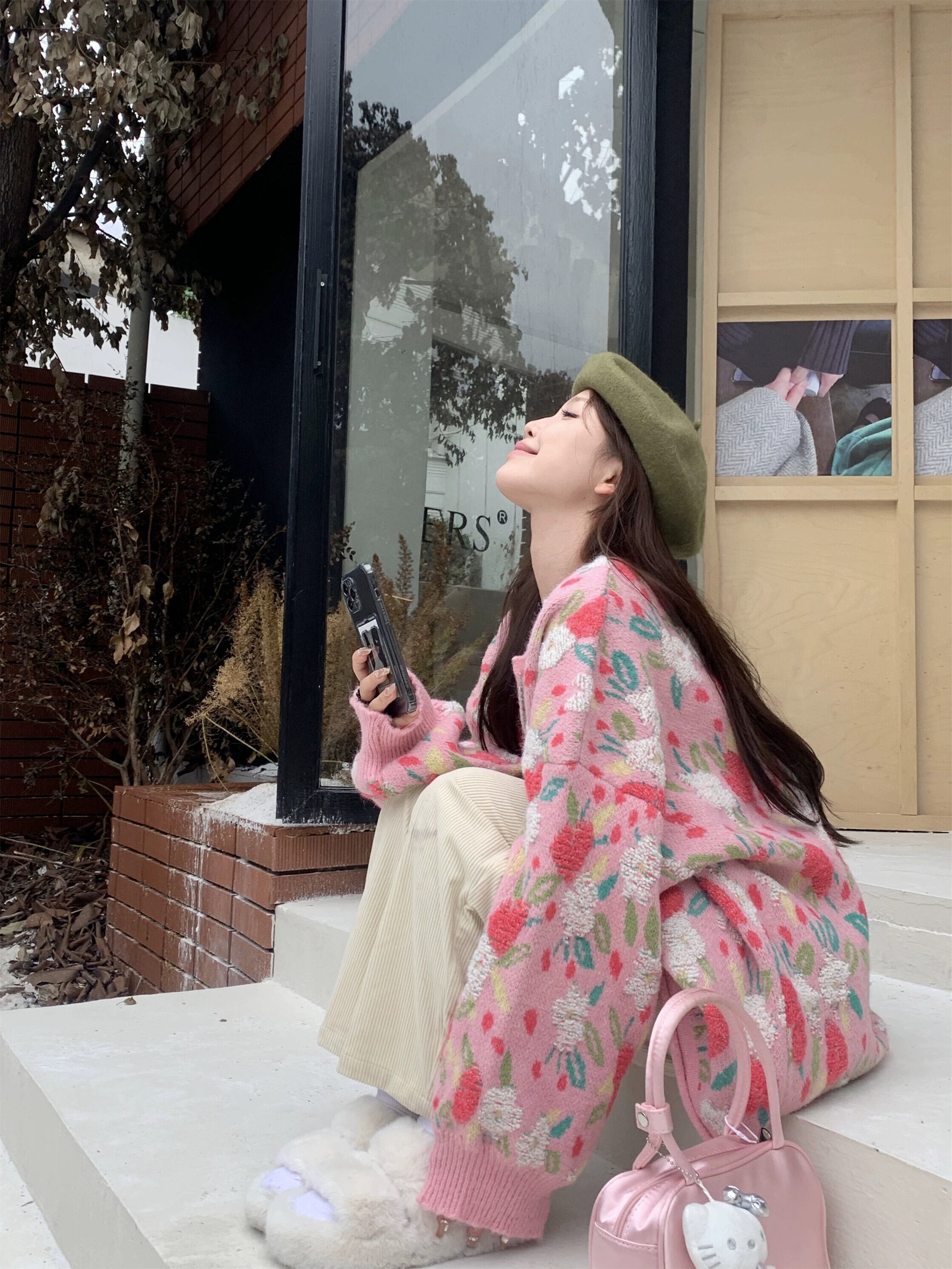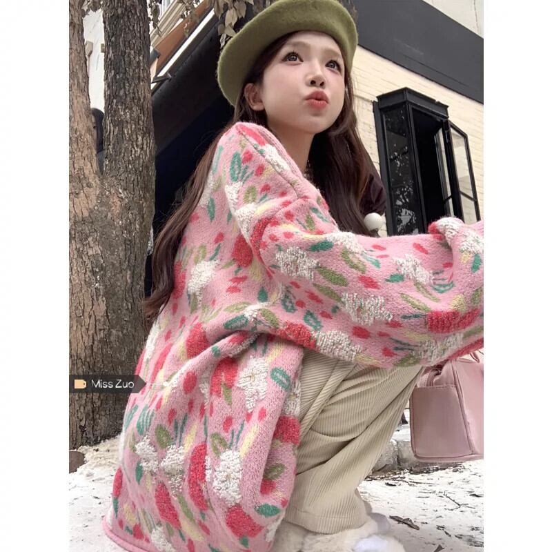 胸ふふ花セータージャケット女性の 2024 年秋冬新作柔らかくワックス状の甘い老化を軽減する超見栄えの良いニットカーディガン 大人ガーリー スウィート キュート カジュアル オータム 秋物 ウィンター 冬物 フラワーデザイン 857169715963424