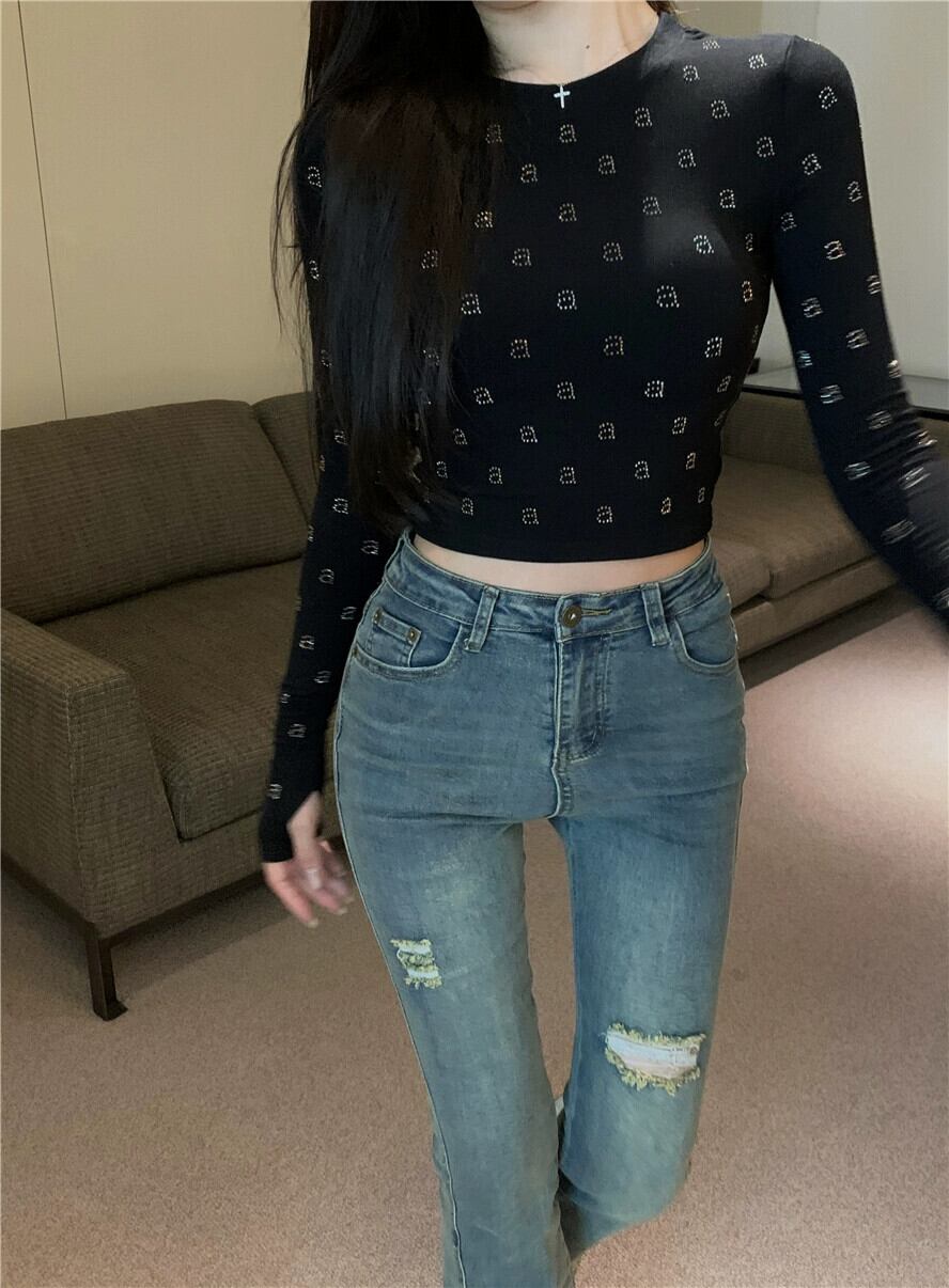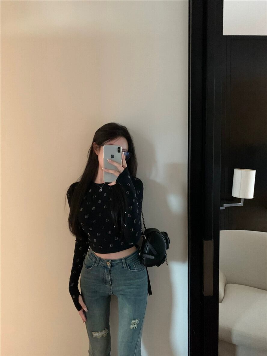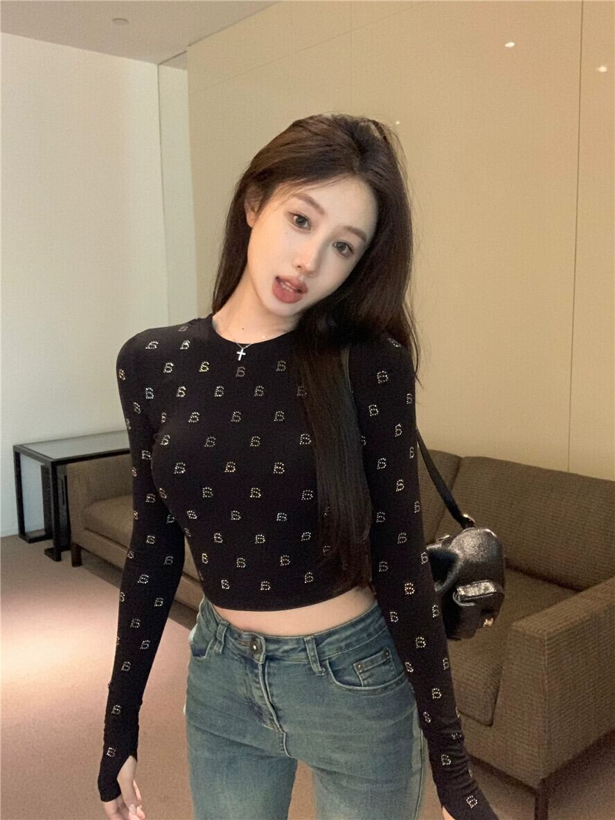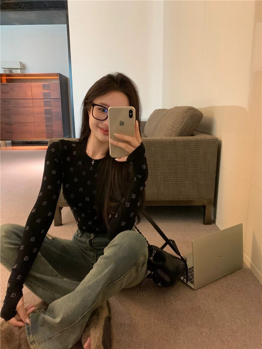 ホットダイヤモンドレタリング長袖Tシャツレディース、秋のインナーレイヤリングシャツ、今年人気のアメリカン、美しいショートトップ ロング オータム 秋物 8571659442171581