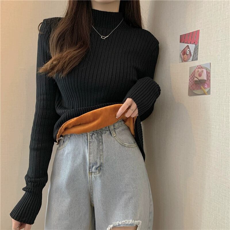 ベルベット肥厚インナーベース層女性の秋と冬暖かいハーフタートルネックアプリコットセーター 2024 新しいニットトップ オータム 秋物 ウィンター 冬物 857163264842720