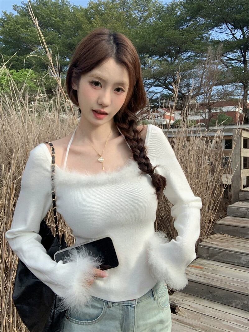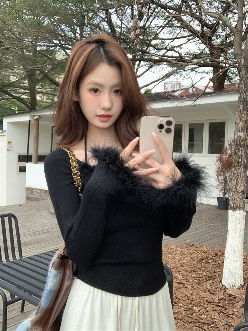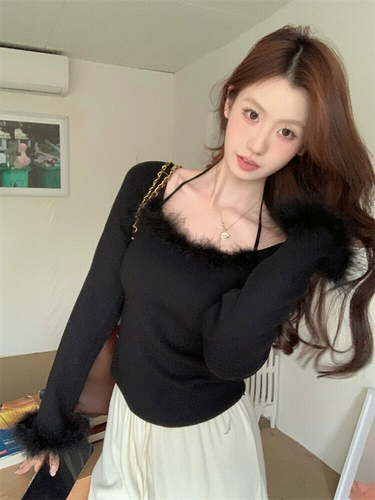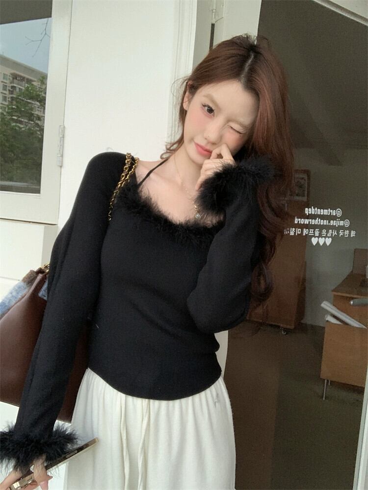 毛皮のようなスプライシングセーターの女性、秋と冬のインナーレイヤリングシャツ、純粋な欲望、シックで美しいデザイン、黒のトップ ブラック オータム 秋物 ウィンター 冬物 ピュア 8571633953677879