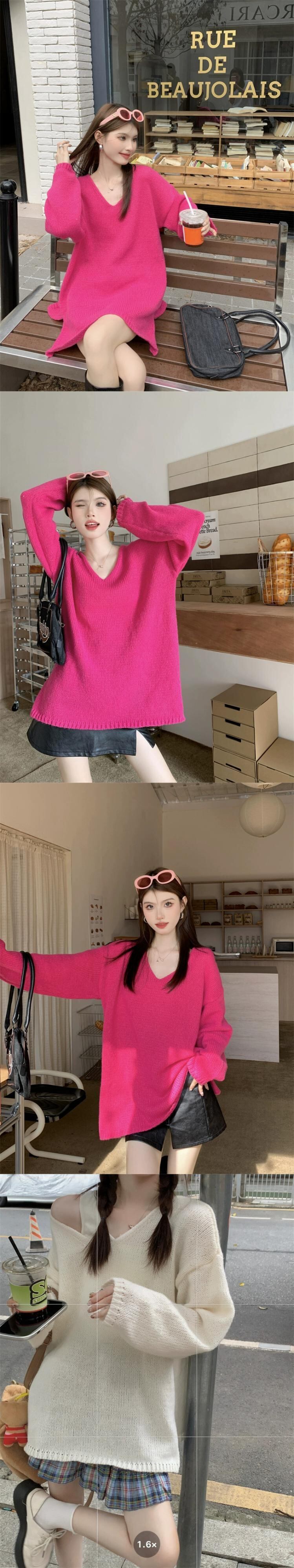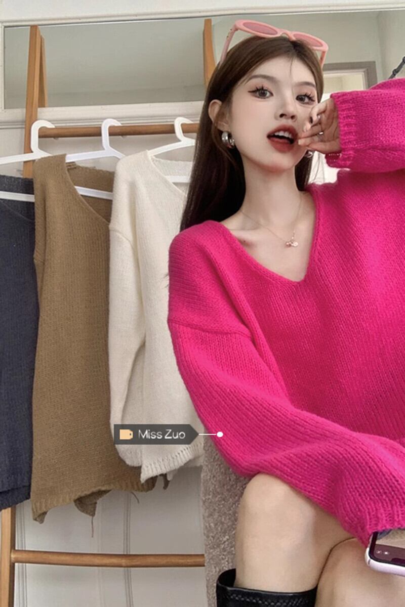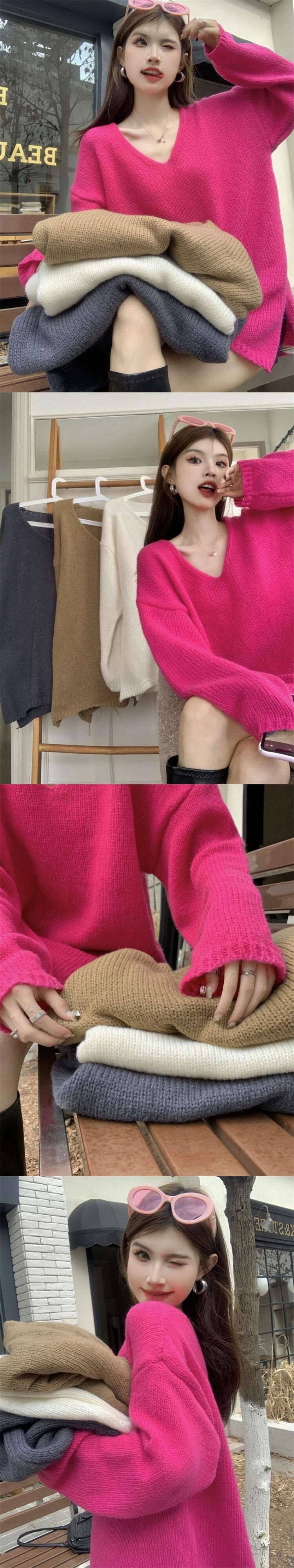 ドラゴンフルーツカラーのプルオーバーセーターレディース秋冬、レイヤードセーター、ゆったりとした怠惰なスタイル、とても素敵なVネックトップ レッド オータム 秋物 ウィンター 冬物 8571621170309910