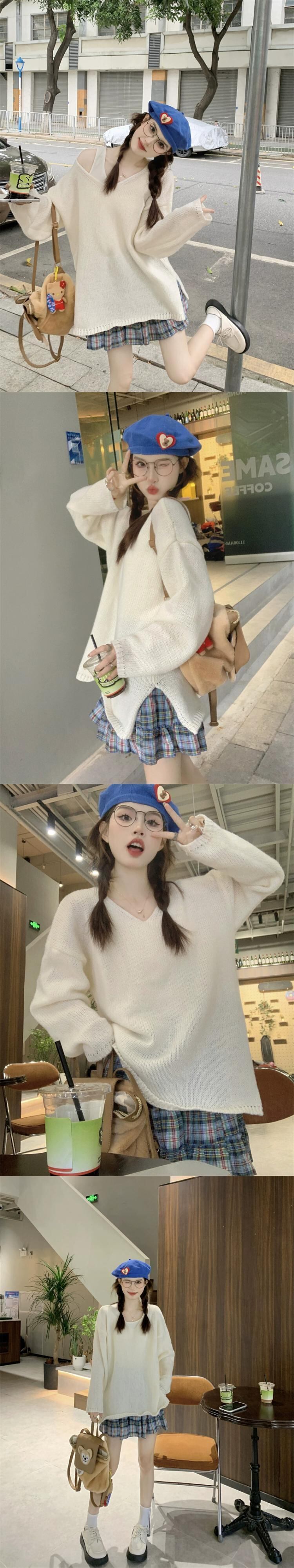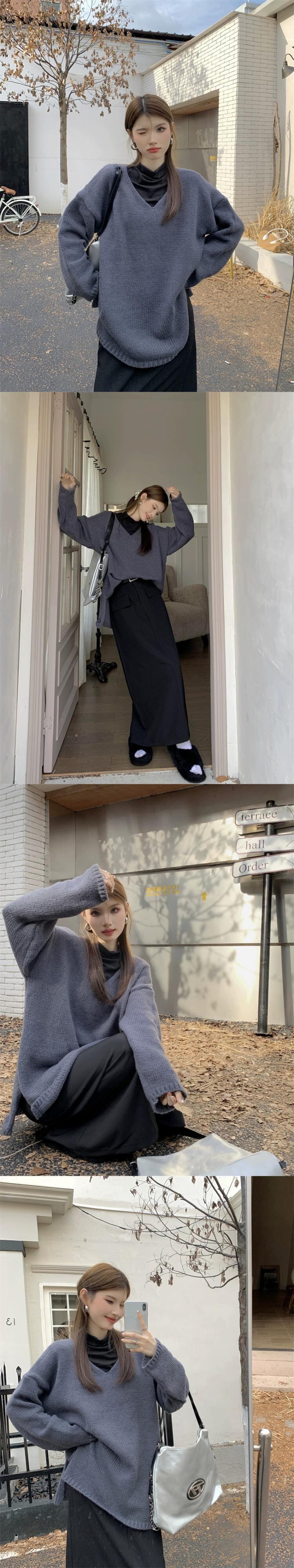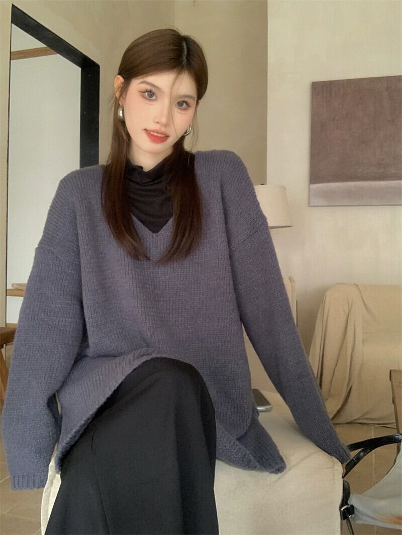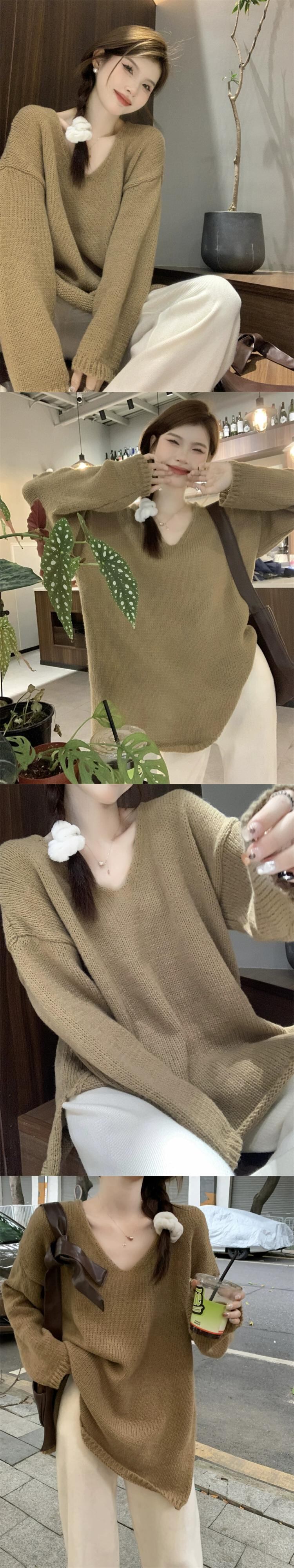 ドラゴンフルーツカラーのプルオーバーセーターレディース秋冬、レイヤードセーター、ゆったりとした怠惰なスタイル、とても素敵なVネックトップ レッド オータム 秋物 ウィンター 冬物 8571621170309910