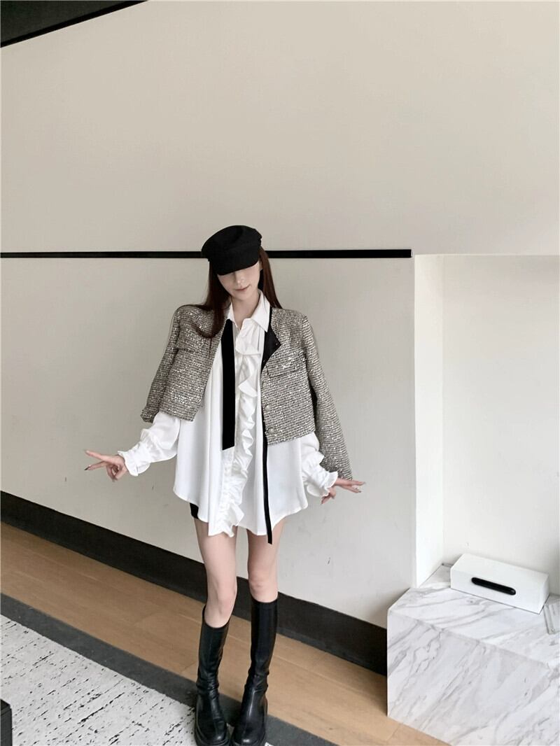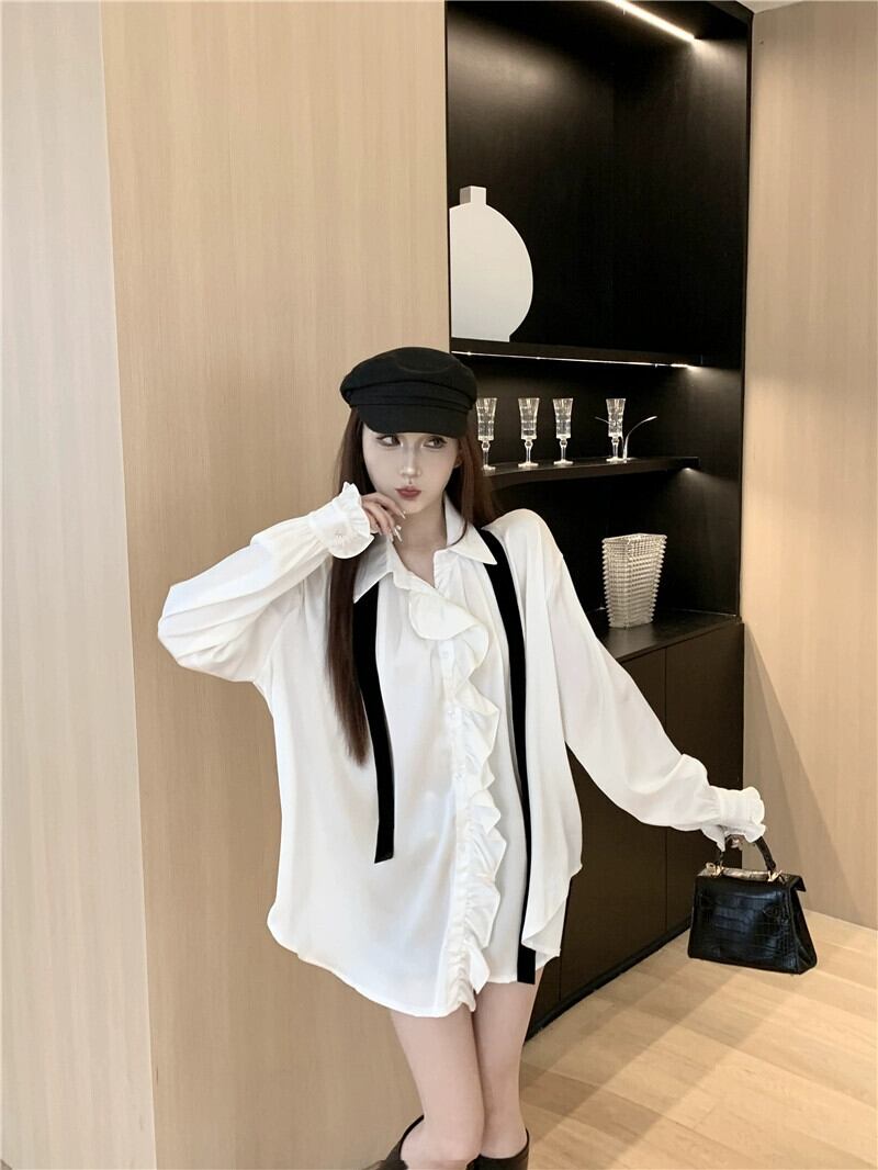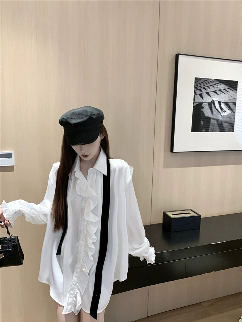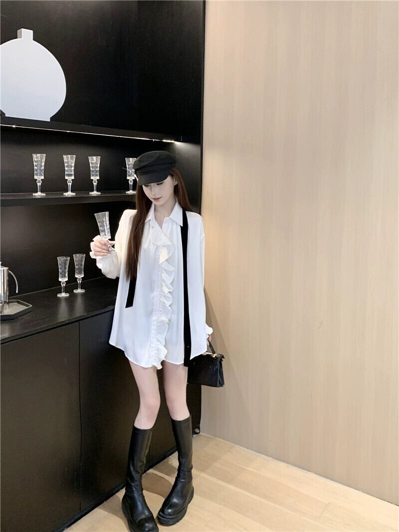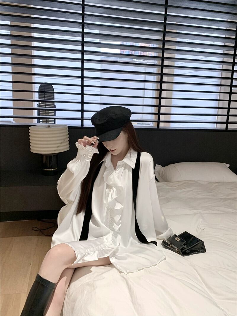 ホワイトサテンシャツレディース秋フリルシャツ2024スタイルシックで美しい長袖トップ ロング オータム 秋物 8571622689112960