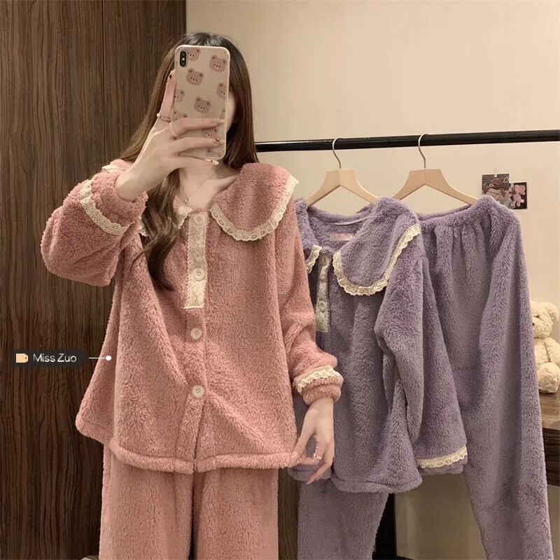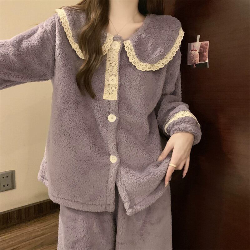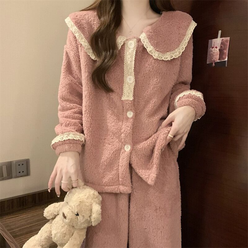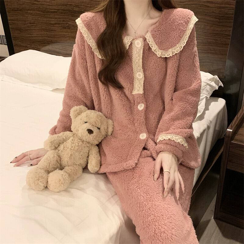 コーラルベルベットパジャマ女性冬肥厚2024新しい甘い暖かい長袖ズボンホームウェアセットは屋外で着用できます ロング 大人ガーリー スウィート キュート カジュアル ウィンター 冬物 8571642365348459