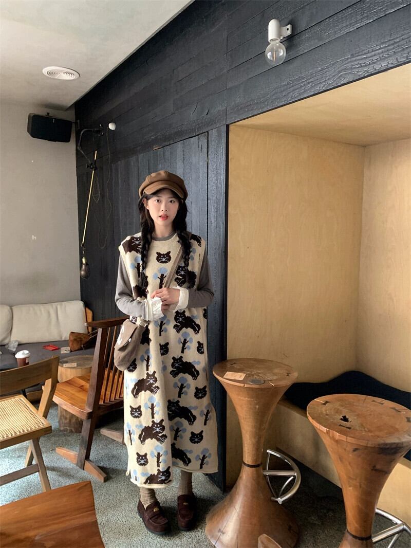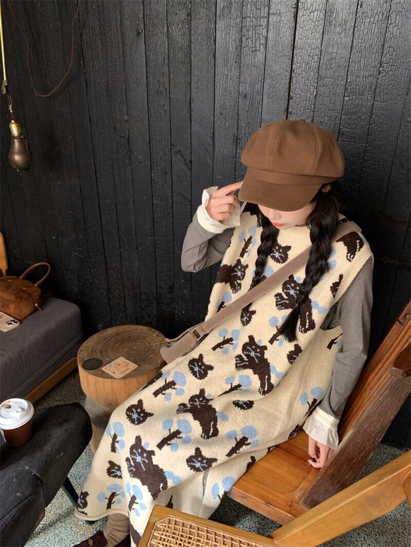ニットベストドレス女性秋と冬 2024 新しい美術学生スタイル甘い年齢を減らす猫ジャカードロングスカート 大人ガーリー スウィート キュート カジュアル オータム 秋物 ウィンター 冬物 8571686196824621