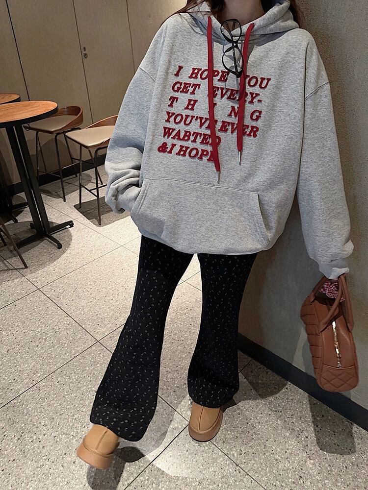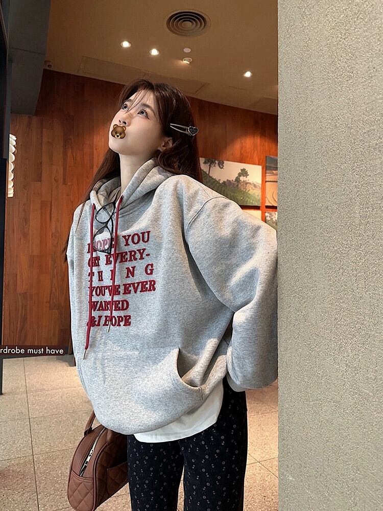 グレーのフード付きスウェットシャツの女性の秋と冬のベルベット肥厚2024新しいスタイルアメリカンレトロ怠惰なスタイルのデザイントップ オータム 秋物 ウィンター 冬物 8571684911064479